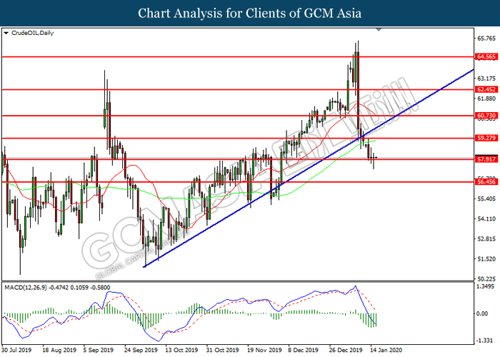 CrudeOIL, Daily: Crude oil price was traded lower while currently testing the support level at 57.90. However, MACD which illustrated diminishing bearish momentum suggest the commodity to be traded higher in short-term as technical correction.