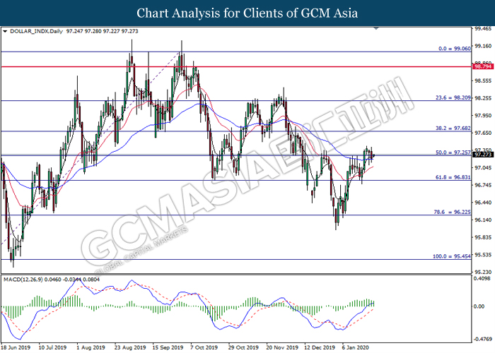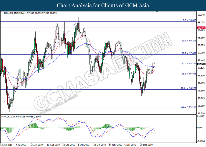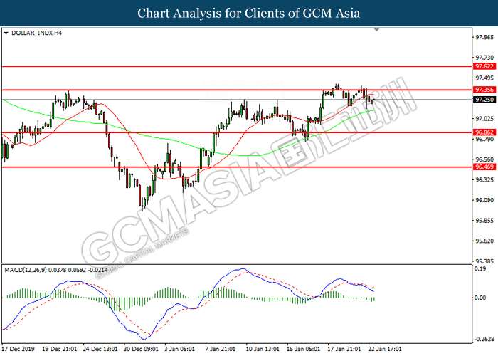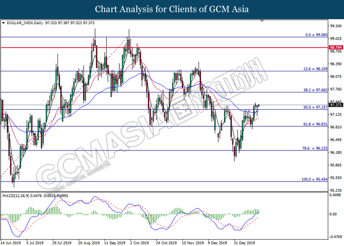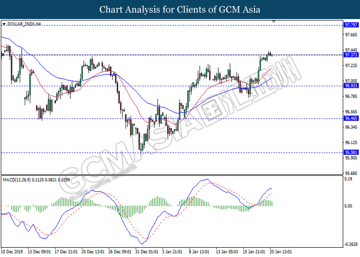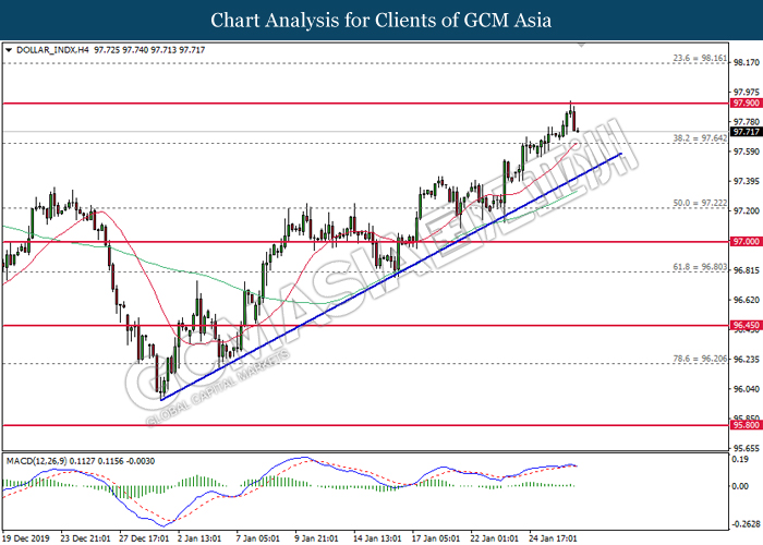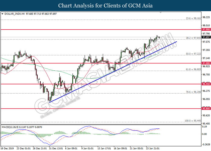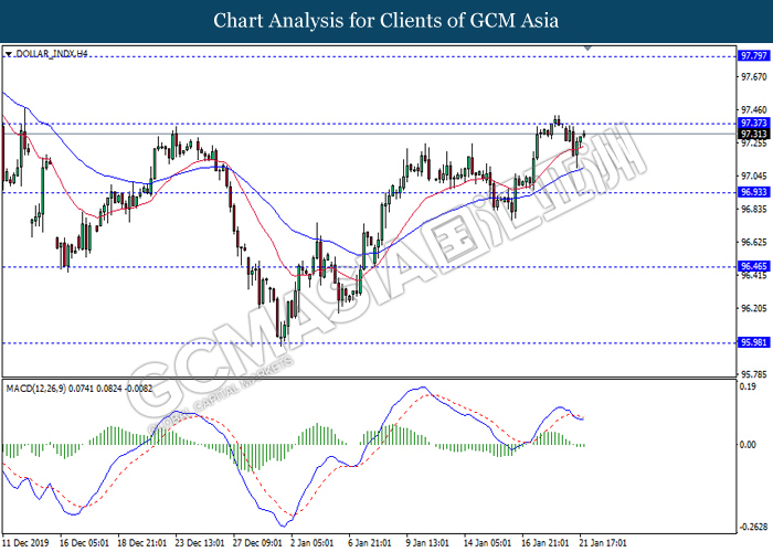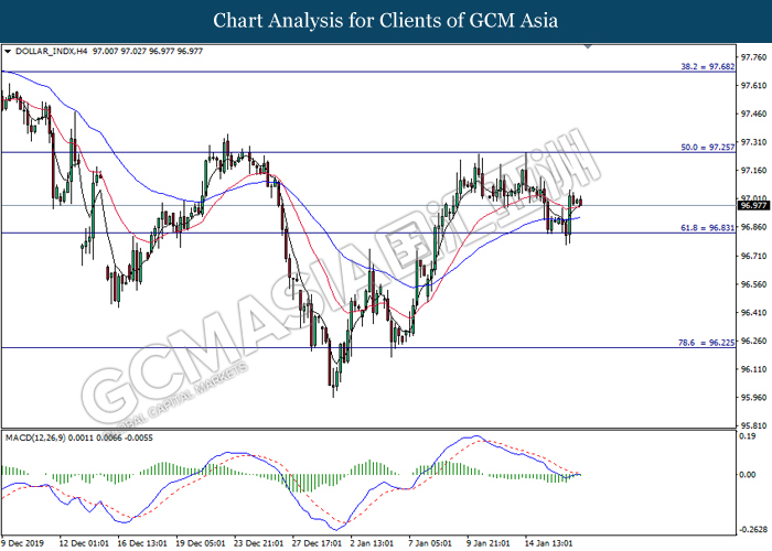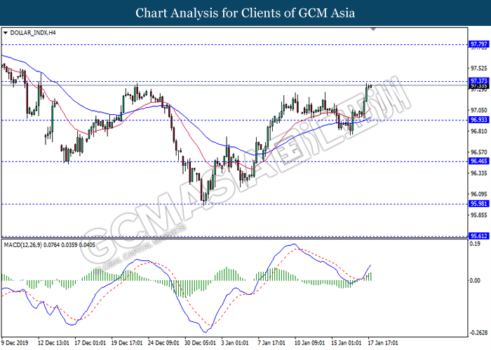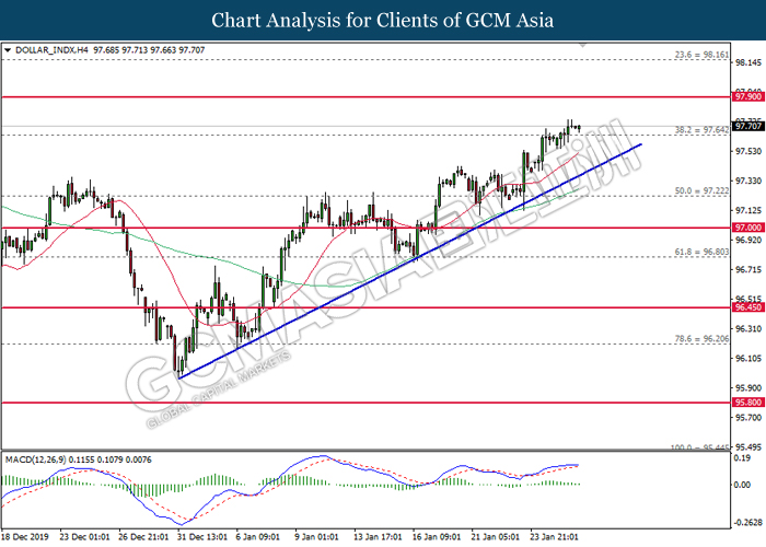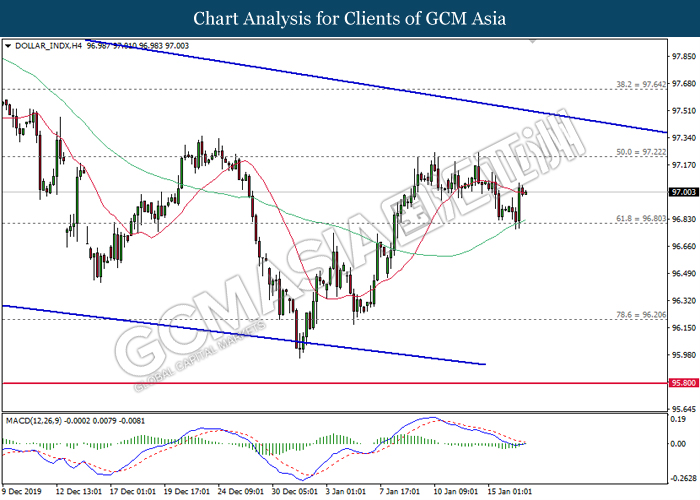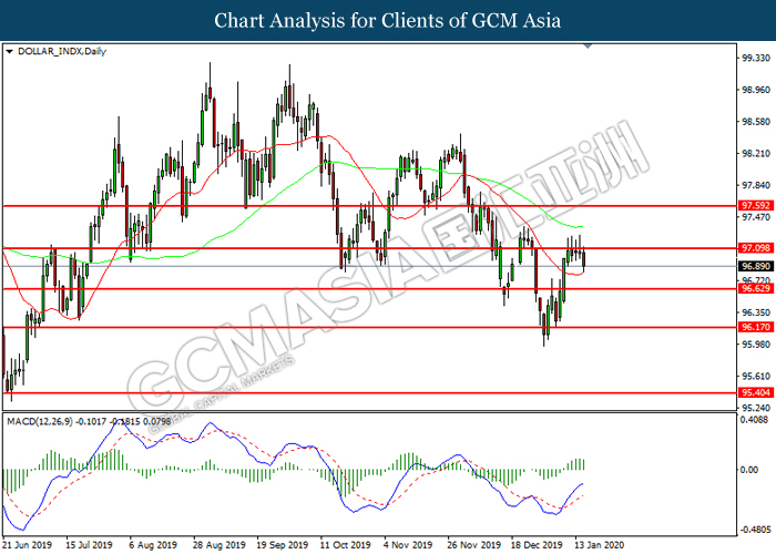 Dollar Index slumped yesterday after United Stated and China signed a “phase-one” trade deal, spurring some trade optimism between the both countries. According to Reuters, the centerpiece of the deal is a pledge by China to purchase at least an additional $200 billion worth of U.S. farm products and other goods and services over two years, while the United Stated promised that they will roll back some tariffs from China. Nonetheless, investors would need to focus on the effectiveness in the implementation of the phase one deal while also scrutinizing the latest updates with regards of the “phase-two” trade deal between the U.S and China in order to receive a further trading signal. Besides that, the dollar index received a further bearish momentum over the backdrop of the bleak economic data from the United Stated. According to U.S. Bureau of Labor Statistics, U.S. Producer Price Index (PPI) for the last month came in at 0.1%, missing the economist forecast of 0.2%, which dialed down the market optimism toward the economic growth in the United Stated while prompting a higher expectation for the rate cut in order to boost the economic progression in future. As of writing, dollar index slumped 0.18% to 96.89.