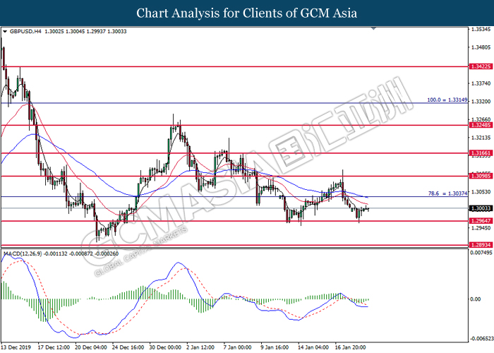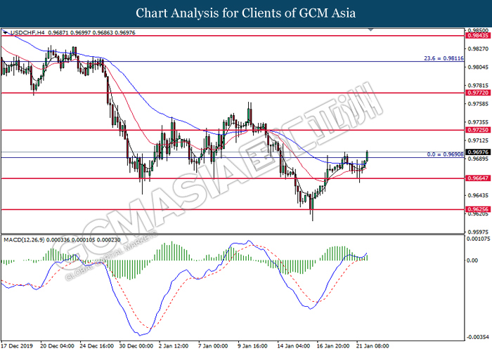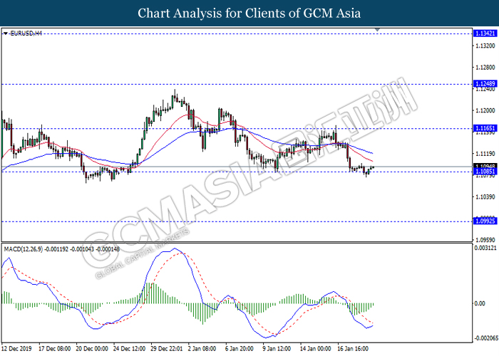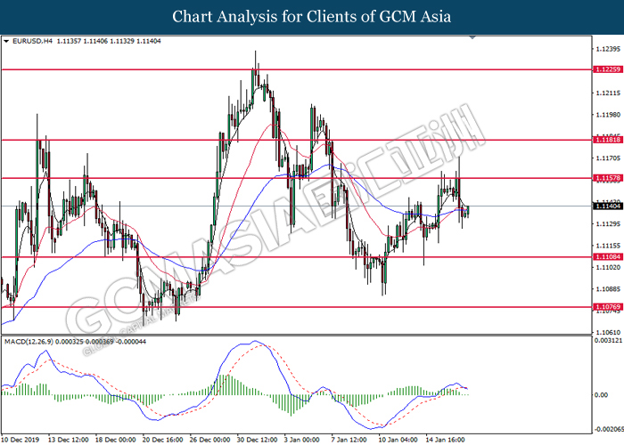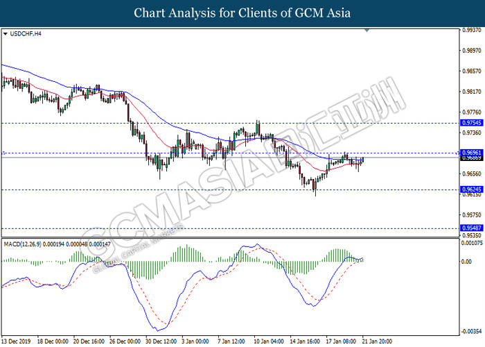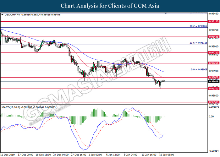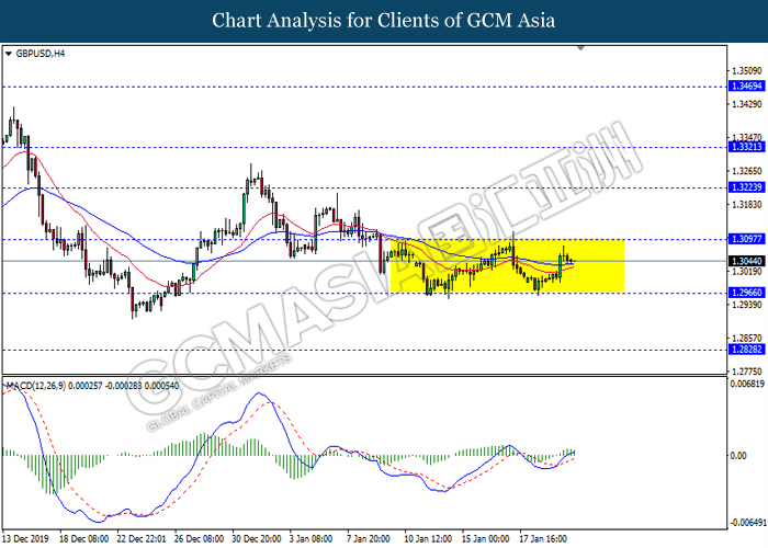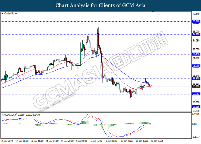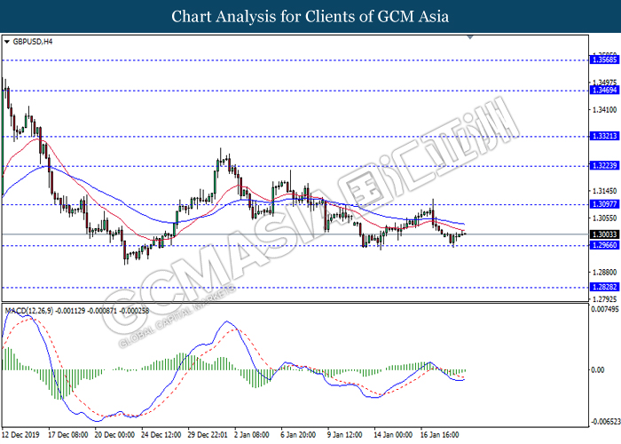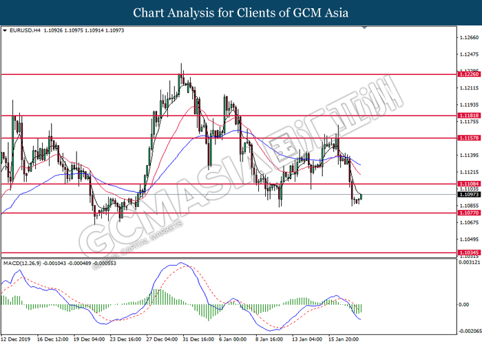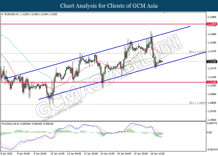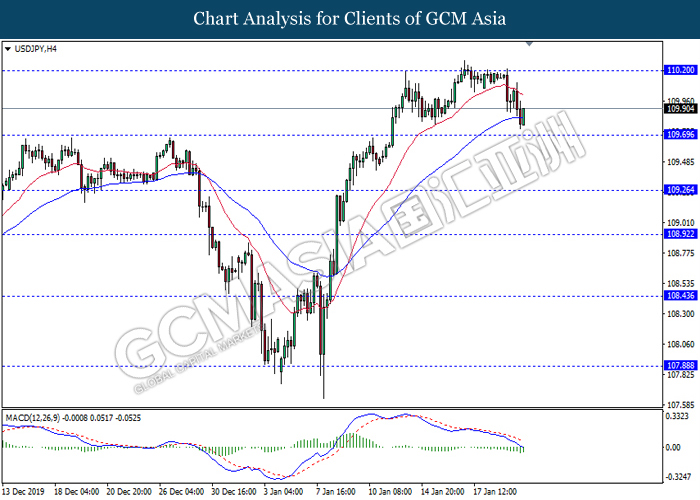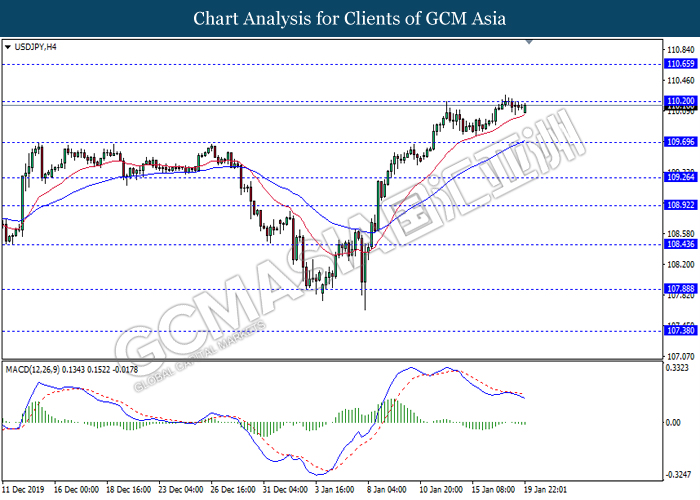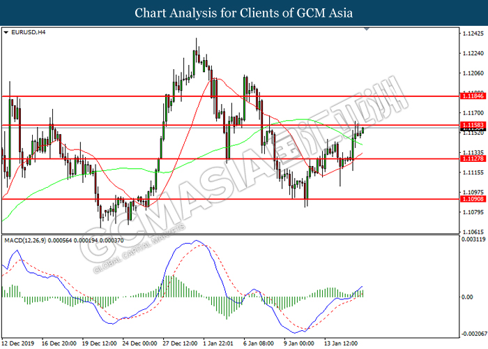 Dollar Index slumped yesterday after United Stated and China signed a “phase-one” trade deal, spurring some trade optimism between the both countries. According to Reuters, the centerpiece of the deal is a pledge by China to purchase at least an additional $200 billion worth of U.S. farm products and other goods and services over two years, while the United Stated promised that they will roll back some tariffs from China. Nonetheless, investors would need to focus on the effectiveness in the implementation of the phase one deal while also scrutinizing the latest updates with regards of the “phase-two” trade deal between the U.S and China in order to receive a further trading signal. Besides that, the dollar index received a further bearish momentum over the backdrop of the bleak economic data from the United Stated. According to U.S. Bureau of Labor Statistics, U.S. Producer Price Index (PPI) for the last month came in at 0.1%, missing the economist forecast of 0.2%, which dialed down the market optimism toward the economic growth in the United Stated while prompting a higher expectation for the rate cut in order to boost the economic progression in future. As of writing, dollar index slumped 0.18% to 96.89.