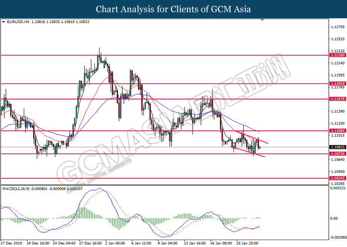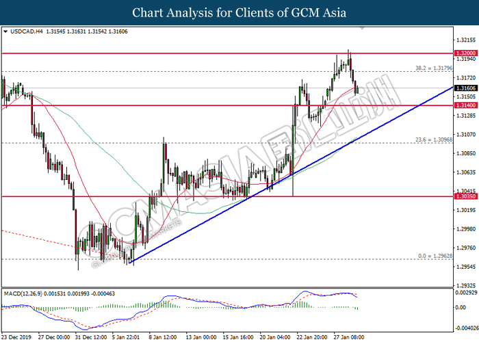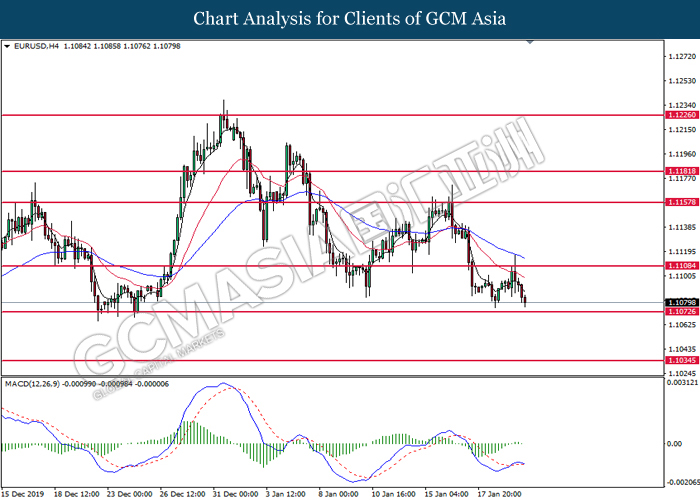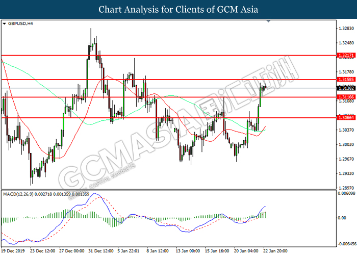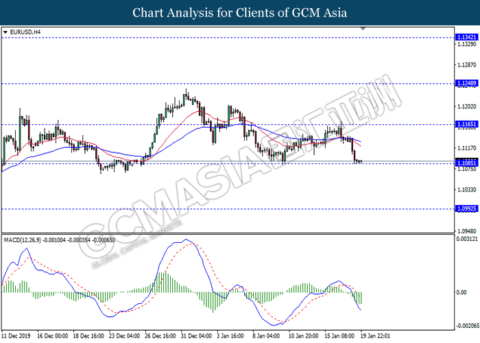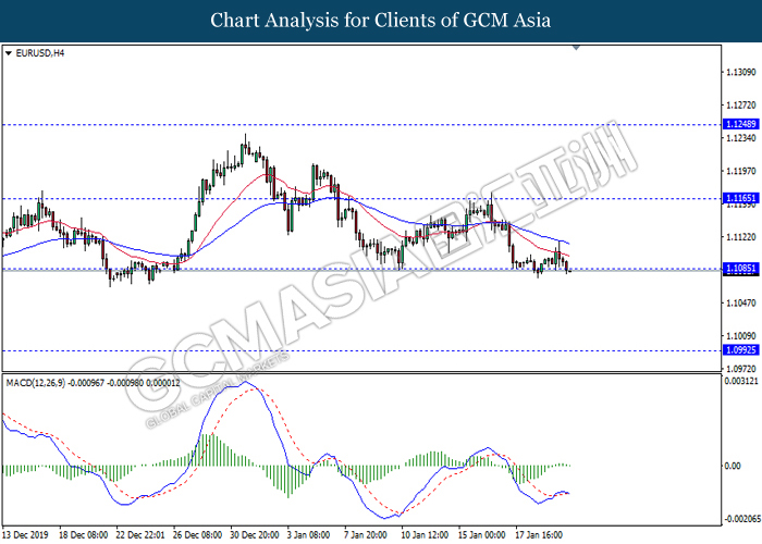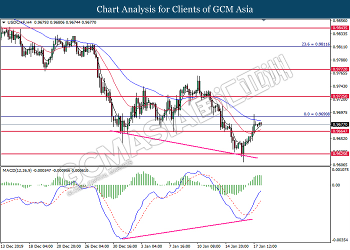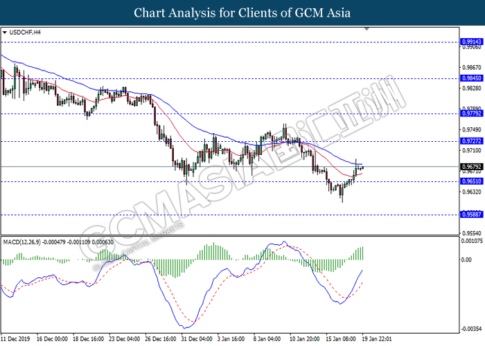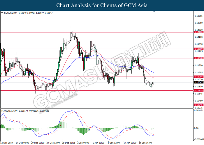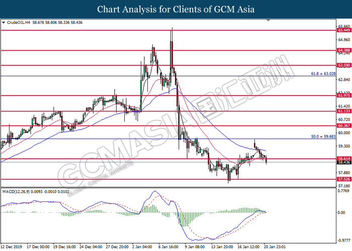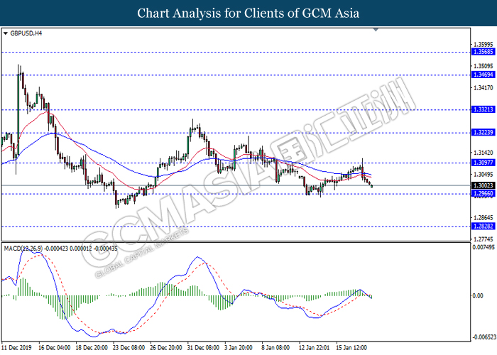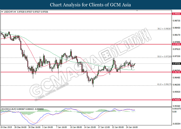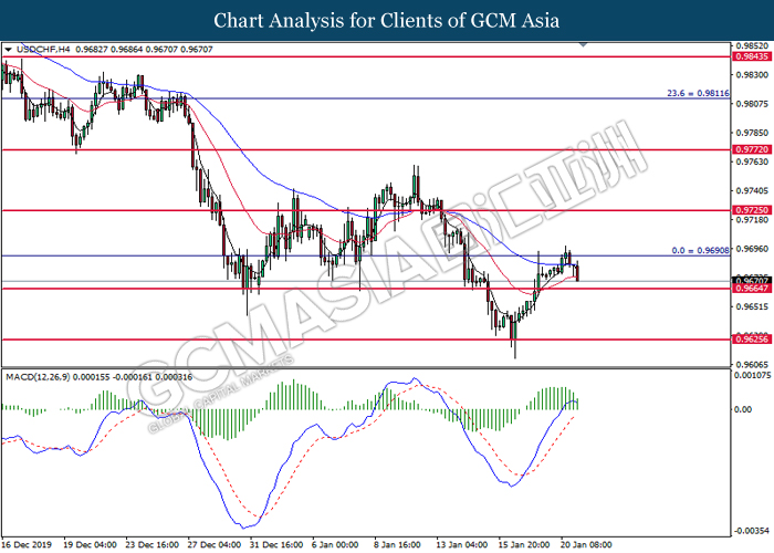 Dollar Index slumped yesterday after United Stated and China signed a “phase-one” trade deal, spurring some trade optimism between the both countries. According to Reuters, the centerpiece of the deal is a pledge by China to purchase at least an additional $200 billion worth of U.S. farm products and other goods and services over two years, while the United Stated promised that they will roll back some tariffs from China. Nonetheless, investors would need to focus on the effectiveness in the implementation of the phase one deal while also scrutinizing the latest updates with regards of the “phase-two” trade deal between the U.S and China in order to receive a further trading signal. Besides that, the dollar index received a further bearish momentum over the backdrop of the bleak economic data from the United Stated. According to U.S. Bureau of Labor Statistics, U.S. Producer Price Index (PPI) for the last month came in at 0.1%, missing the economist forecast of 0.2%, which dialed down the market optimism toward the economic growth in the United Stated while prompting a higher expectation for the rate cut in order to boost the economic progression in future. As of writing, dollar index slumped 0.18% to 96.89.