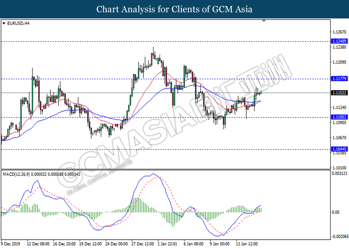 EURUSD, H4: EURUSD was traded higher while currently testing the resistance level at 1.1160. MACD which illustrated increasing bullish momentum suggest the pair to extend its gains after it successfully breakout above the resistance level.