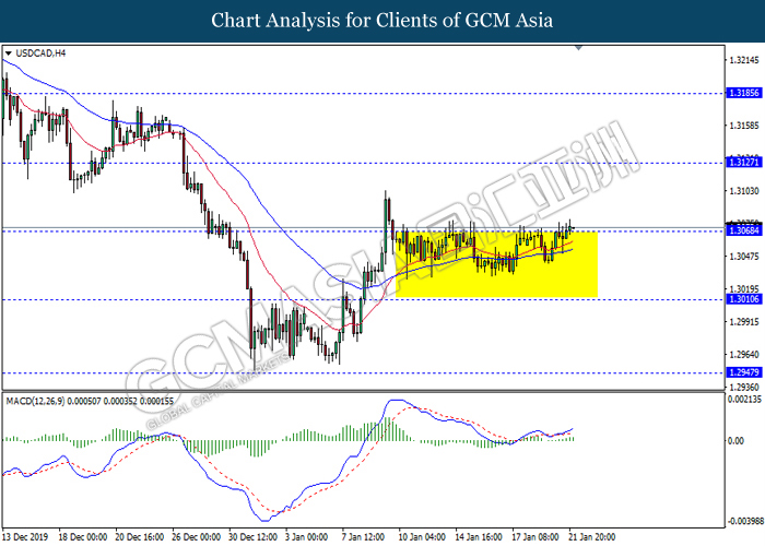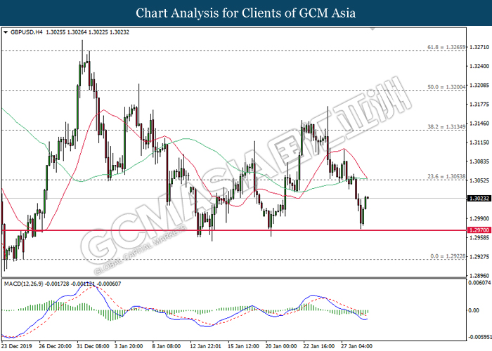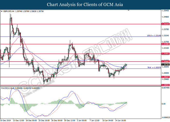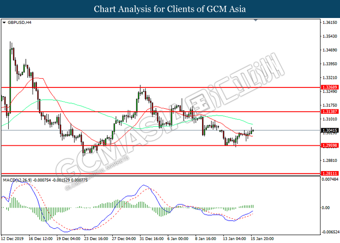GBPUSD, H4: GBPUSD was traded higher following prior rebound from the support of 1.2970. MACD which illustrate diminished downward momentum suggests the pair to be traded higher in short-term.