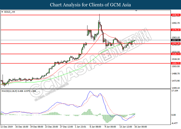 GOLD_, H4: Gold price was traded higher following prior breakout above the previous resistance level at 1550.30. MACD which illustrated increasing bullish momentum suggest the commodity to extend its gains toward resistance level at 1578.35.
