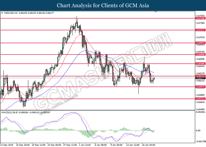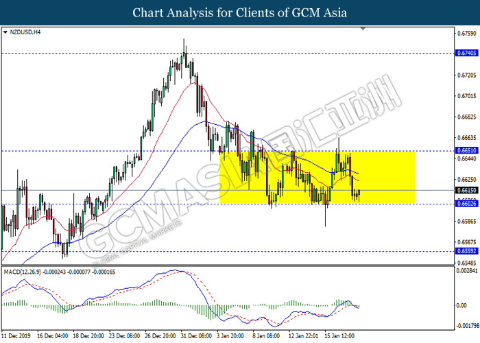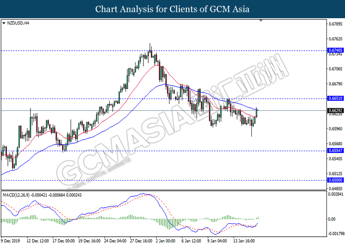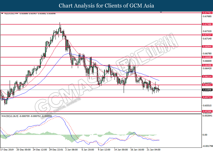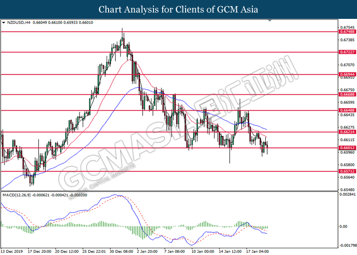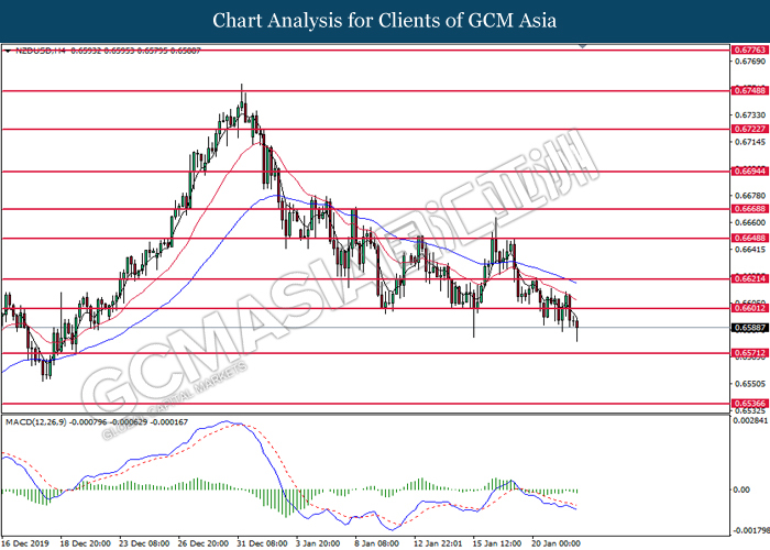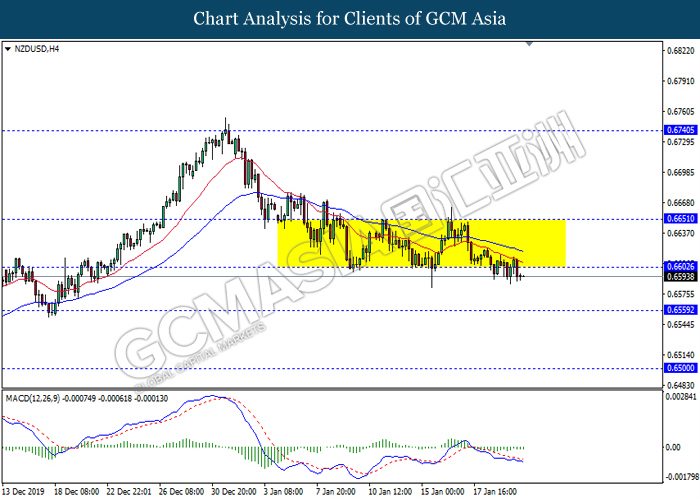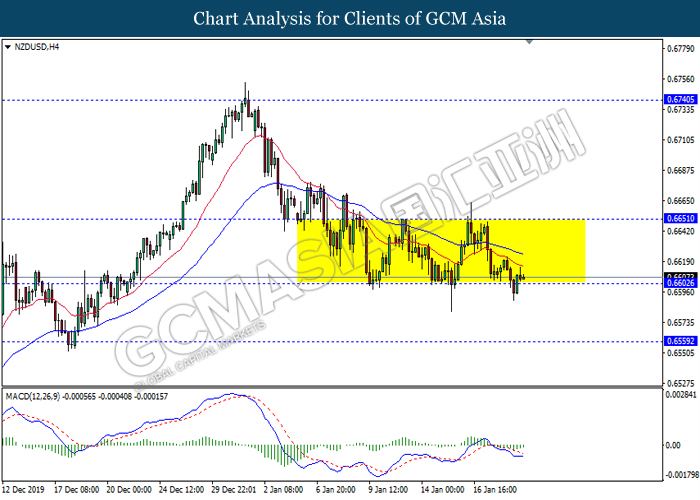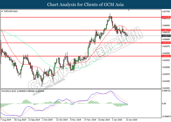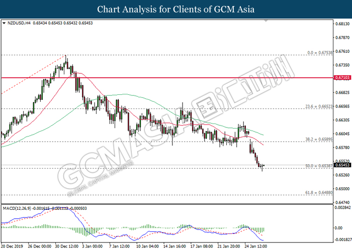 NZDUSD, H4: NZDUSD was traded lower while currently testing at the support of 0.6540. MACD which illustrate bearish signal suggests the pair to extend its losses after closing below the support level.