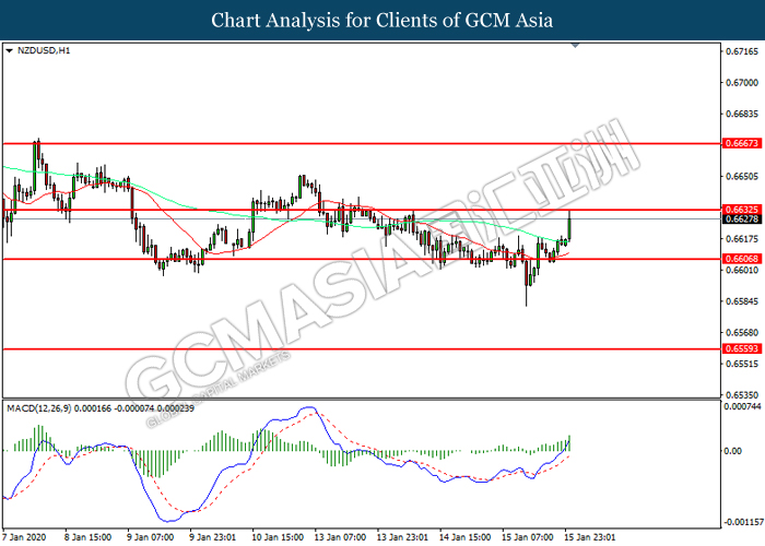 NZDUSD, H1: NZDUSD was traded higher while currently testing the resistance level at 0.6635. MACD which illustrated increasing bullish momentum suggest the pair to extend its gains after it successfully breakout above the resistance level.