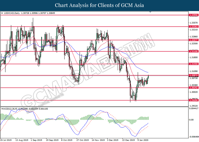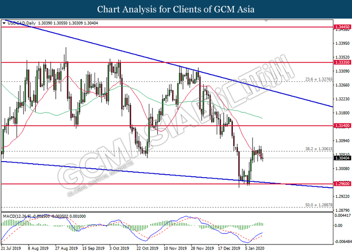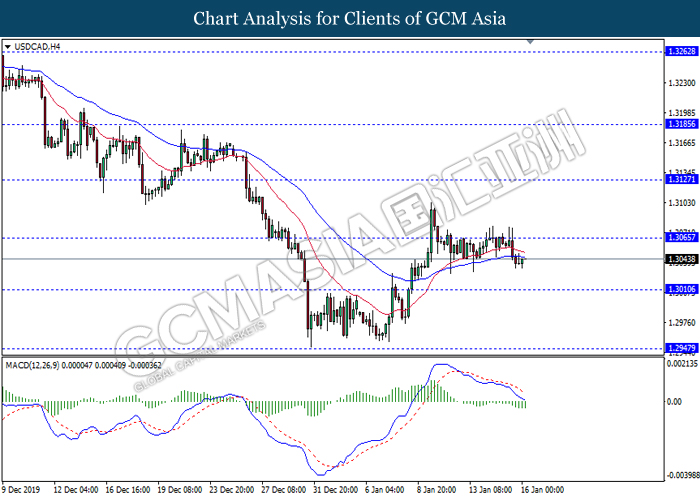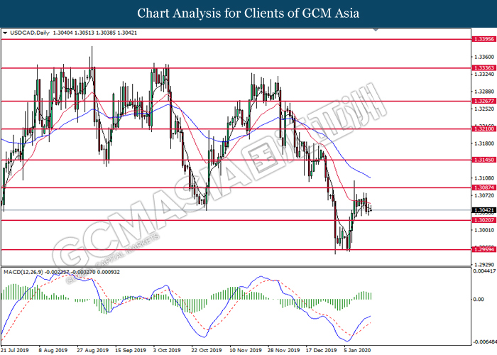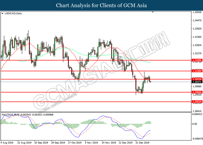 USDCAD, Daily: USDCAD was traded lower following prior retracement from the resistance level at 1.3055. MACD which illustrated diminishing bullish momentum suggest the pair to extend its losses toward support level at 1.3045.