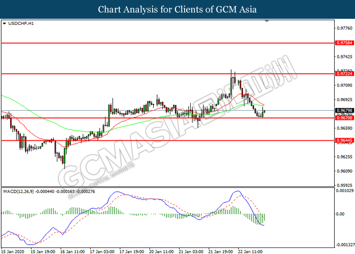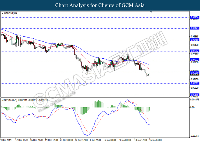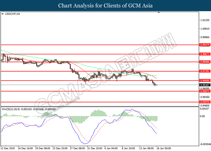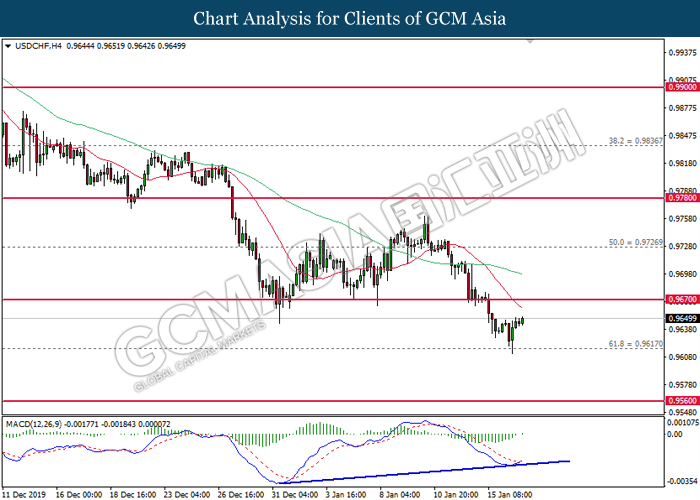 USDCHF, H4: USDCHF was traded lower following prior breakout below the previous support level at 0.9670. However, MACD which illustrated diminishing bearish momentum suggest the pair to be traded higher in short-term as technical correction.