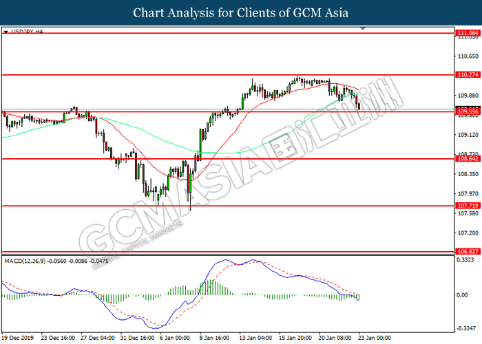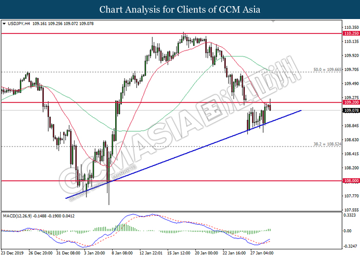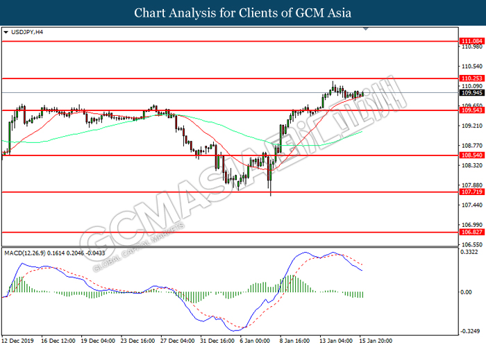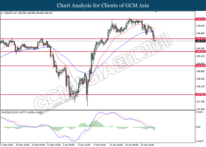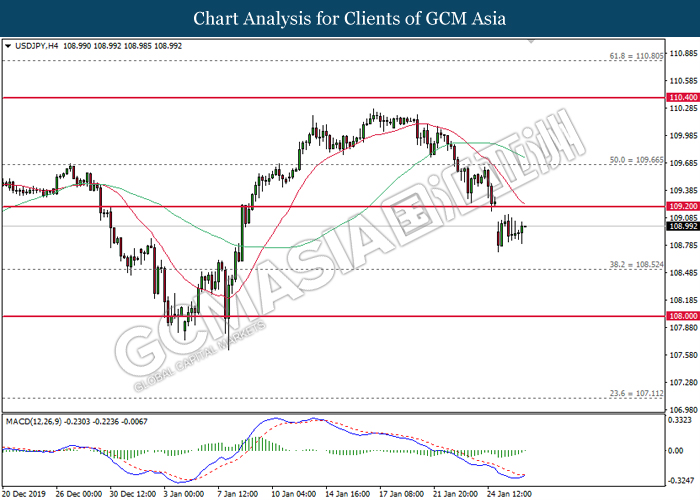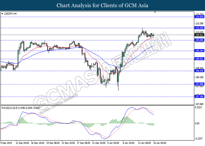 USDJPY, H4: USDJPY was traded lower following prior retrace from 109.20. MACD which illustrate diminished upward momentum suggests the pair to be traded lower in short-term as technical correction.