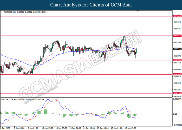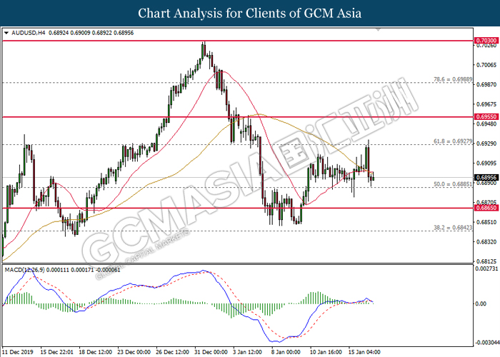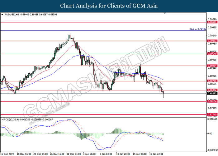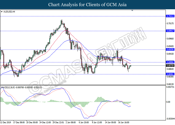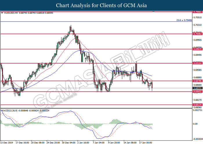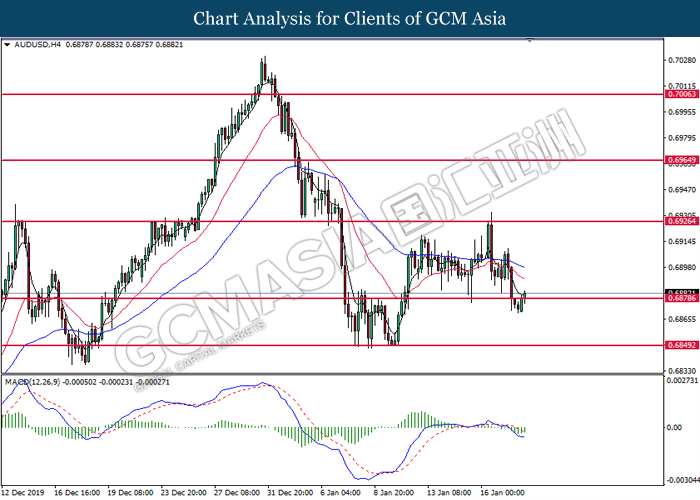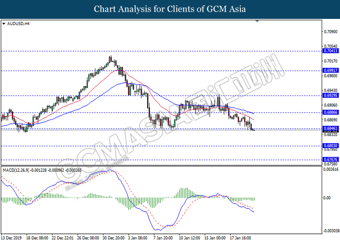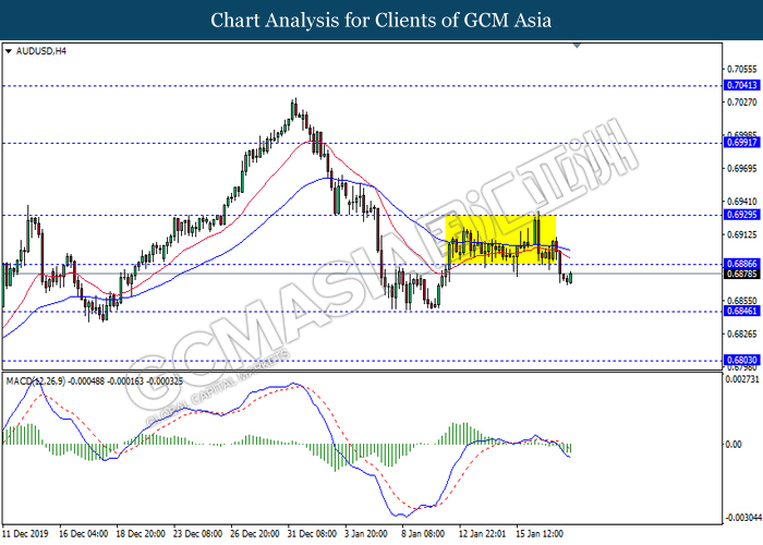 AUDUSD, H4: AUDUSD was traded lower while currently testing near the support of 0.6885. MACD which formed a bearish signal suggests the pair to extend its losses after closing below the support level.