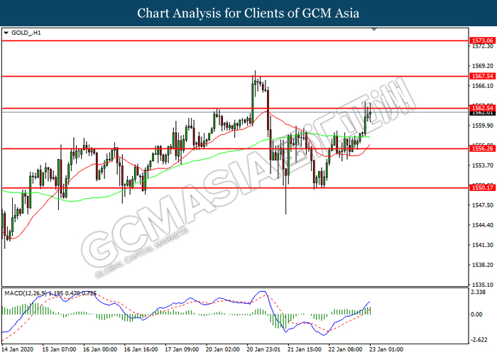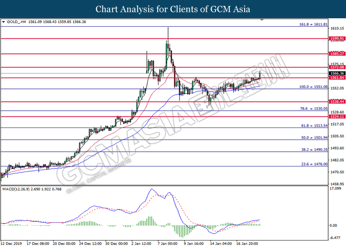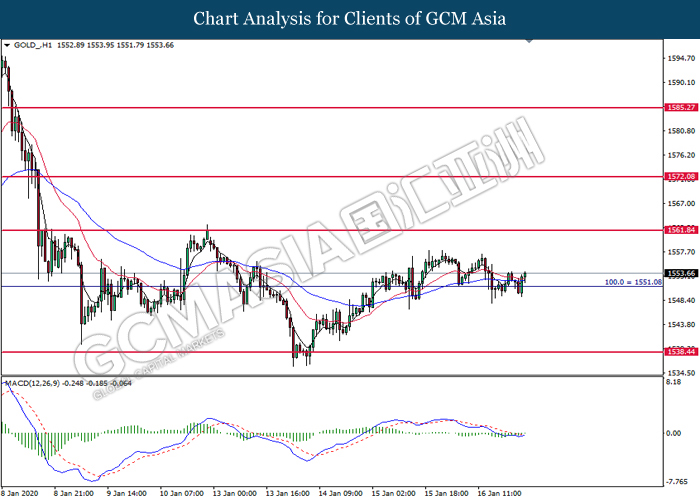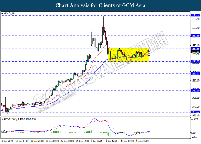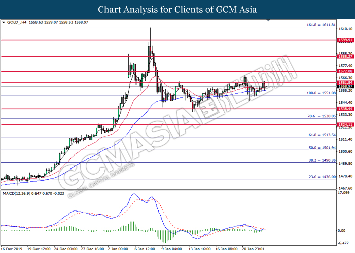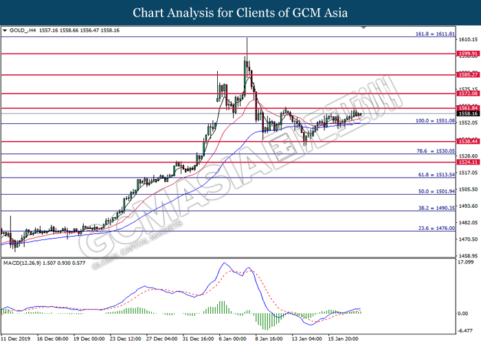 GOLD_, H1: Gold price was traded higher following prior rebound near the support level at 1551.10. MACD which shows diminishing downward momentum suggests its price to be traded higher in short term toward the resistance level at 1561.85.