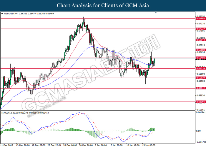 NZDUSD, H4: NZDUSD was traded higher following prior rebound from the lower level. MACD which illustrate diminished downward momentum suggests the pair to be traded higher in short-term.