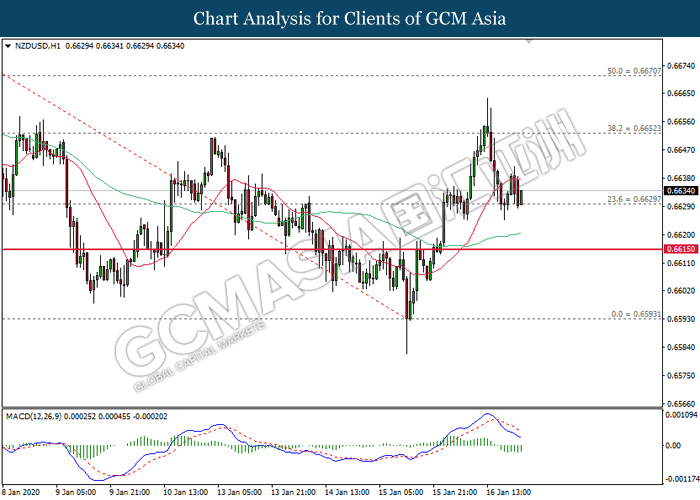 NZDUSD, H1: NZDUSD was traded higher following prior rebound from the support level. MACD which illustrate diminished downward momentum suggests the pair to be traded higher in short-term.