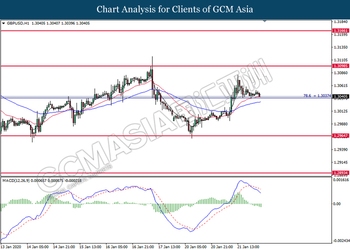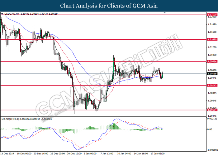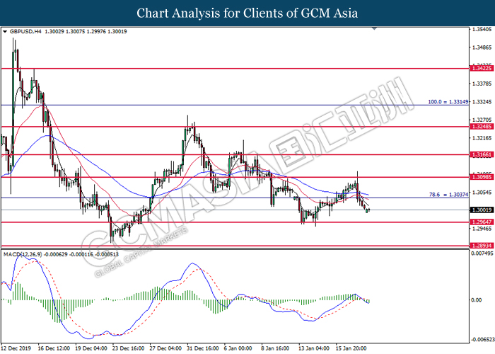 GBPUSD, H4: GBPUSD was traded lower while currently testing at the support of 1.3055. MACD which illustrate bearish signal suggests the pair to extend its losses after closing below the support level.