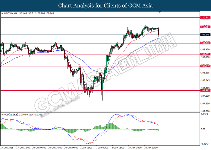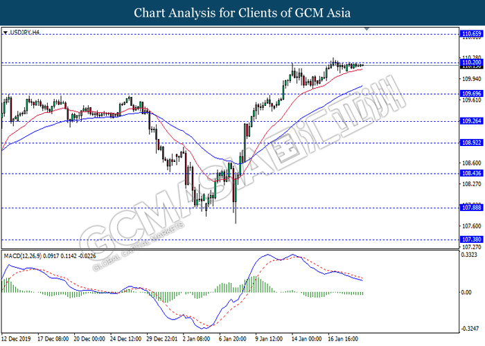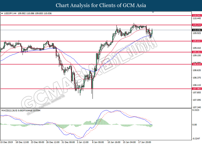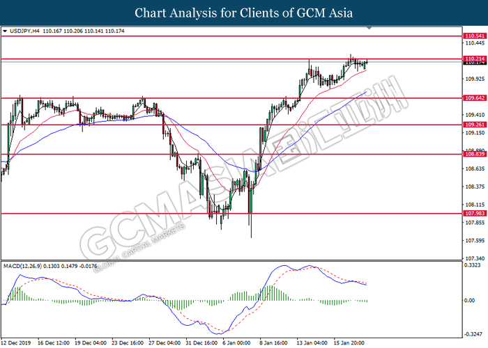 USDJPY, H4: USDJPY was traded within a range while currently near the resistance level at 110.25. MACD which illustrated increasing bearish momentum suggest the pair to be traded lower in short-term as technical correction.