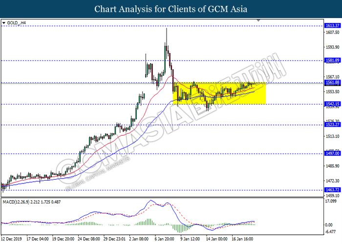 GOLD_, H4: Gold price remain traded in a sideway channel while currently testing near the resistance level 1561.90. MACD which illustrate bullish bias signal with the recent formation of golden cross suggest the commodity to be traded higher after it breaks above the resistance level.