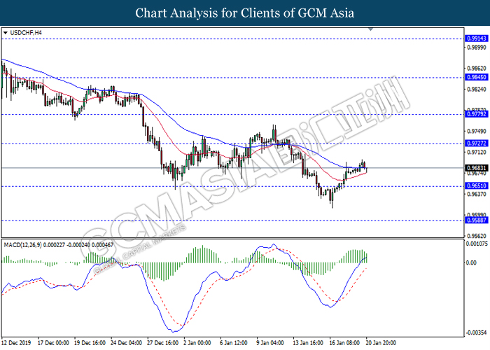 USDCHF, H4: USDCHF was traded lower while currently testing the support level 0.9650. However, MACD which illustrate diminishing bearish momentum suggest the pair to experience a technical correction in short term towards the resistance level 0.9725.