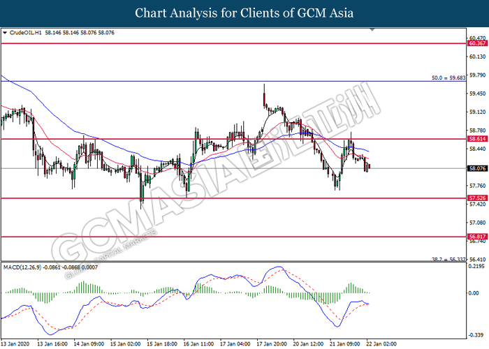 CrudeOIL, H4: Crude oil was traded higher while currently testing the resistance level at 58.60. MACD which illustrate bullish signal suggests this commodity to extend its gains after it successfully breakout above the resistance level at 58.60.