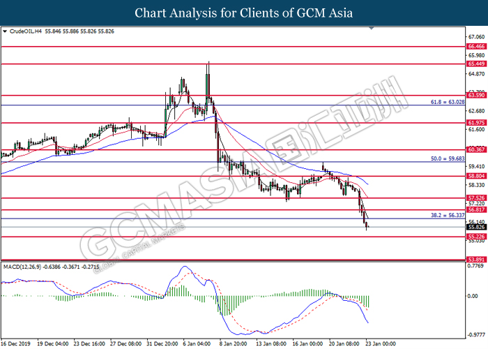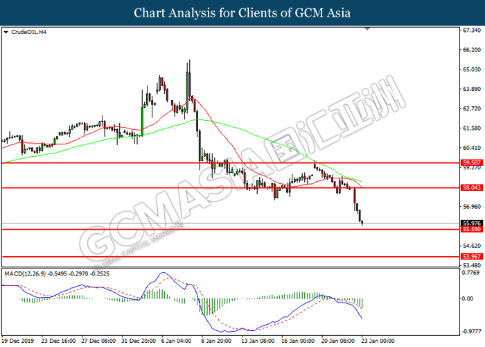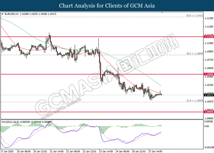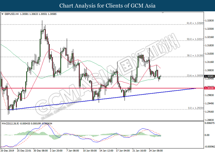 Greenback experienced some bearish pressure this morning over the backdrop of bearish housing data from the United States. According to US Commerce Department, New Home Sales for the month of December fell by 0.4% to 694,000 units, lower than analysts’ forecast of 730,000 units. Sales of new homes has slipped for its third consecutive month which is likely due to a shortage of affordable homes in the United States. However, many traders believe that US housing market remains supported by lower mortgage rates after Federal Reserve cut interest rates by three times last year. As of writing, the dollar index ticked down 0.03% to 97.66. On the other hand, safe-haven Japanese yen extended its gains following higher concern over China’s coronavirus which may bring possible impact towards its economy. According to The Hill, the coronavirus could have claimed more than 100 lives and infected more than 30,000 individuals within China, significantly higher than official data released by Beijing. Policymakers in China has banned travels and extended the Lunar New Year break in order to prevent further infections domestically and internationally. Analysts’ postulate that consumer spending and tourism business is expected to take a toll, which may further impact China’s economy which has significant signs of slowdown. During Asian trading session, pair of USD/JPY ticked down 0.01% to 108.97.