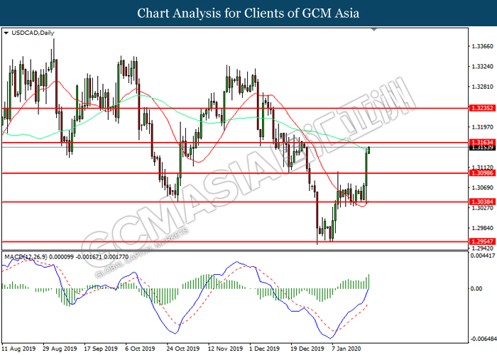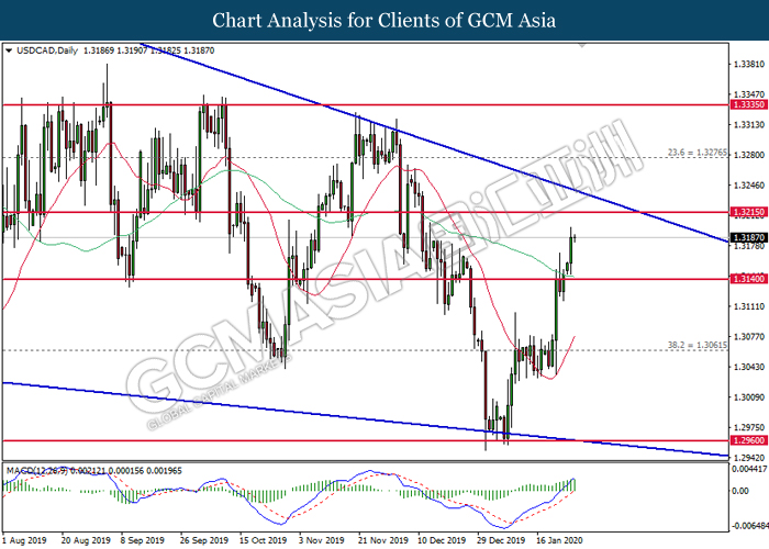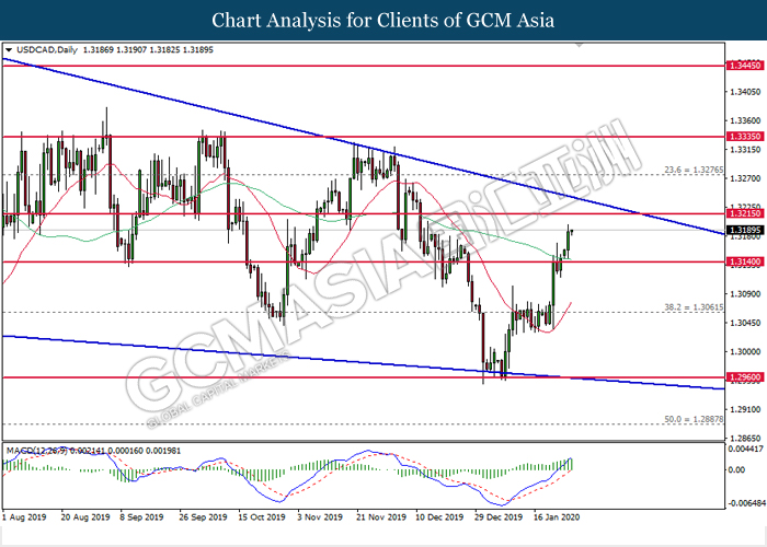 USDCAD, Daily: USDCAD was traded higher following prior rebound from the lower level. MACD which illustrate bullish signal suggests the pair to extend its gains, towards the direction of 1.3215.