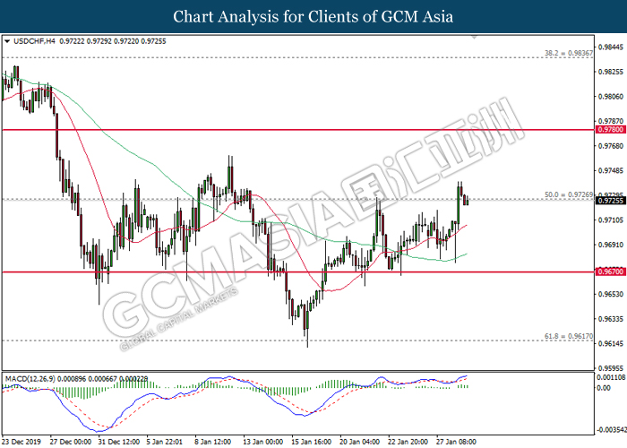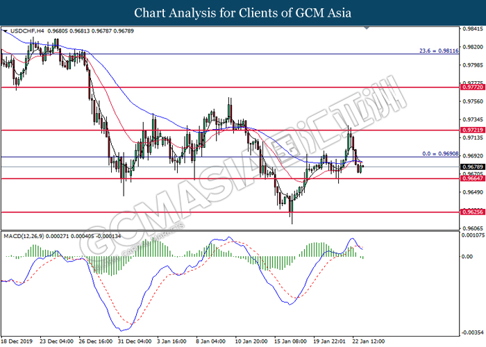 USDCHF, H4: USDCHF was traded lower following prior retracement from its higher level. MACD which illustrate diminished upward momentum suggests the pair to be traded lower in short-term as technical correction.