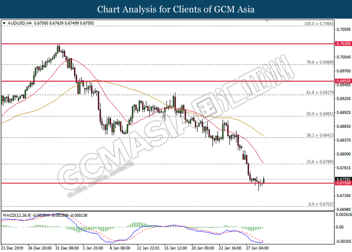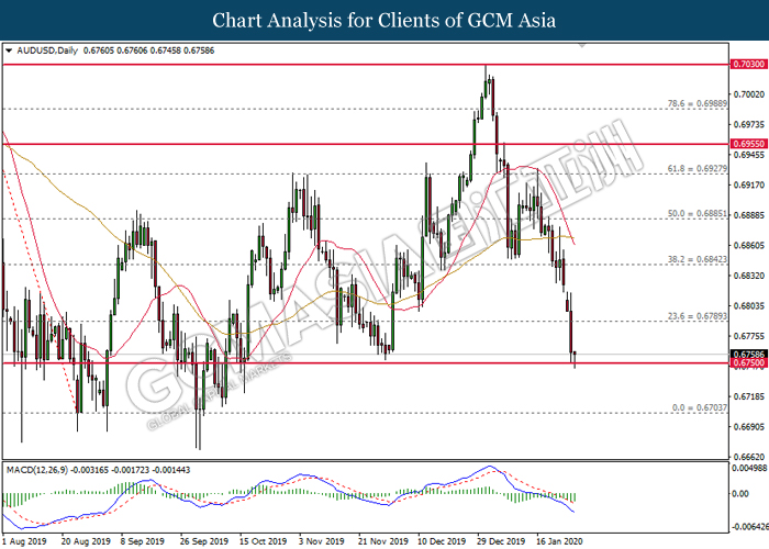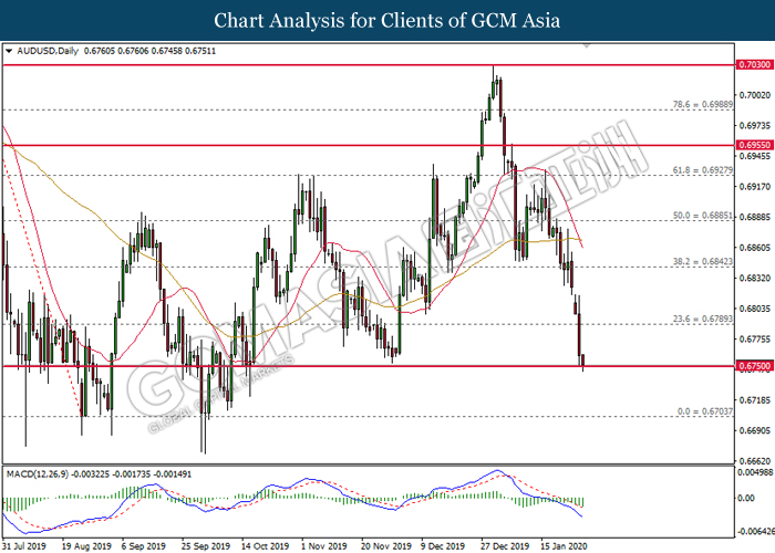AUDUSD, Daily: AUDUSD was traded lower while currently testing at the support of 0.6750. MACD which illustrate bearish signal suggests the pair to be traded lower after closing below the support level.