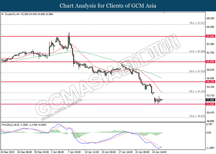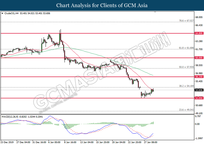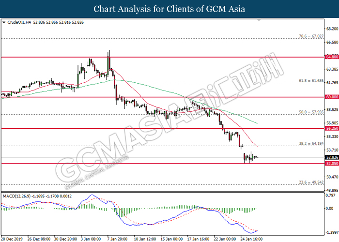 CrudeOIL, H4: Crude oil price was traded flat near the support of 52.05. MACD which begin to form bullish signal suggest its price to be traded higher in short-term as technical correction.