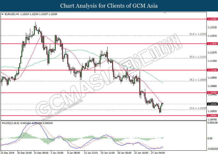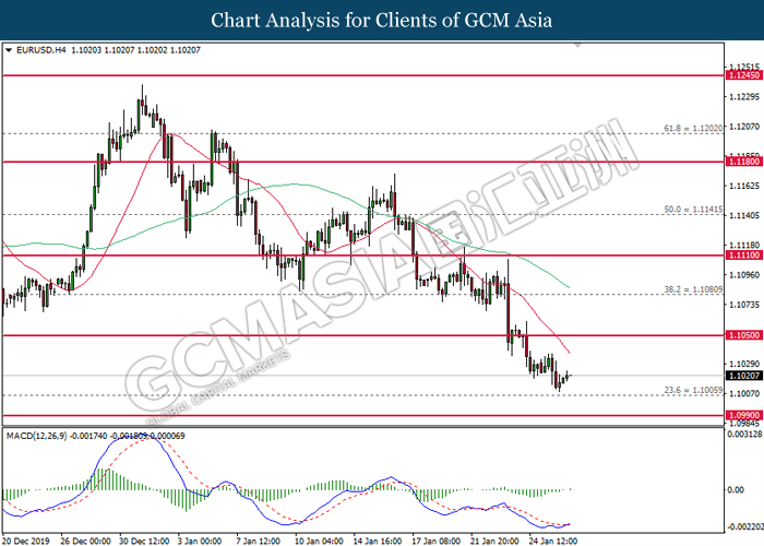 Dollar index which gauge its value against a basket of six major currencies hovered near the two month highs level while markets are still scrutinizing the next move of Federal Reserve (Fed) in term of monetary policy. Despite Federal Reserve had adjusted the US cash rates downward for 3 times in the year of 2019, majority of the investors are still seeing Fed members will likely to have another round of rate cut in the upcoming Fed meeting. According to the Fed Rate Monitor Tool, the probability of rate cut has been rising to 87.8% while the previous day probability was still 86.7%, indicating that the unfolding monetary policy in US does not satisfied the ‘appetite’ of investors. Moreover, sluggish economy in US which shown by recent lackluster economic data also further cemented the reasonableness of a rate cut is necessary for current US economy. As of writing, dollar index inched down 0.02% to 97.70. On the other hand, the pair of EUR/USD notched up 0.05% to 1.1020 after falling to the lowest level since 2th Dec 2019 amid downbeat data continues to weigh on this single currency. According to German Ifo Institute, German Ifo Business Climate Index came in at 95.9, lower than the forecast of economist at 97.0, showing that the business sector in Germany have a dim in future.