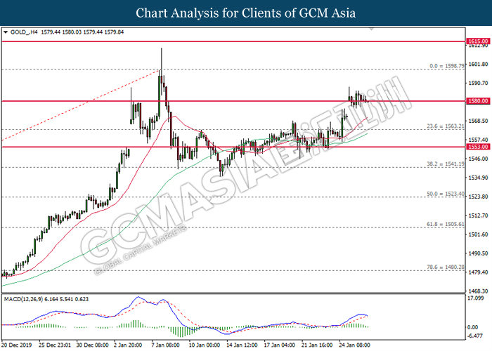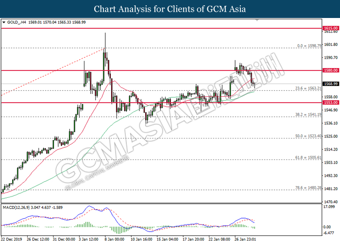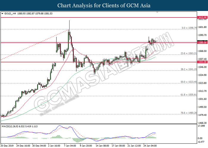 GOLD_, H4: Gold price was traded lower while currently testing at the support near 1580.00. MACD which illustrate bearish signal suggests its price to extend its losses after closing below the support level.
