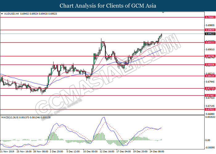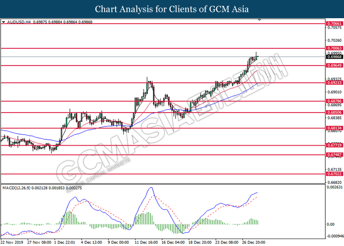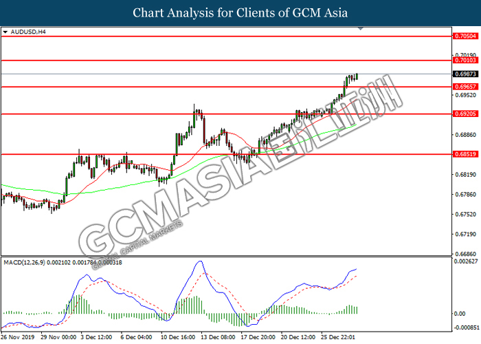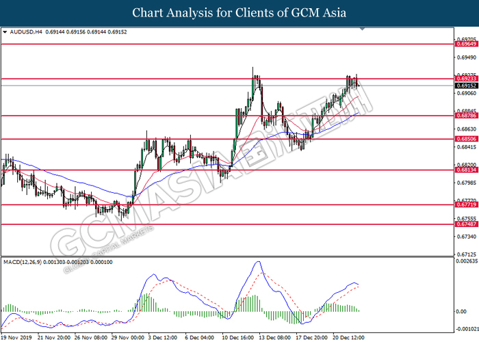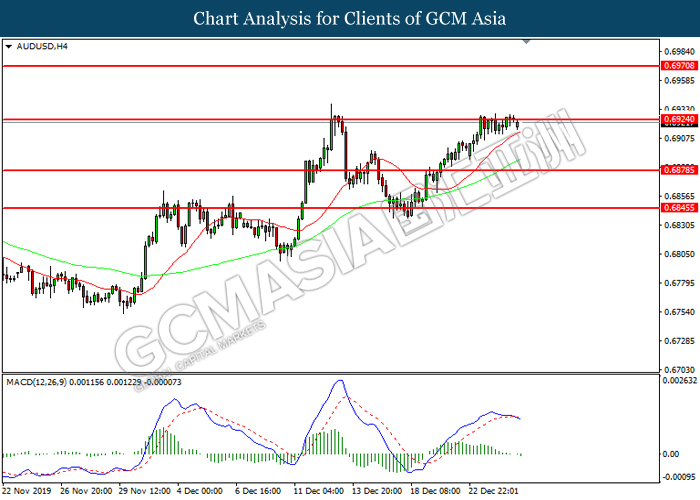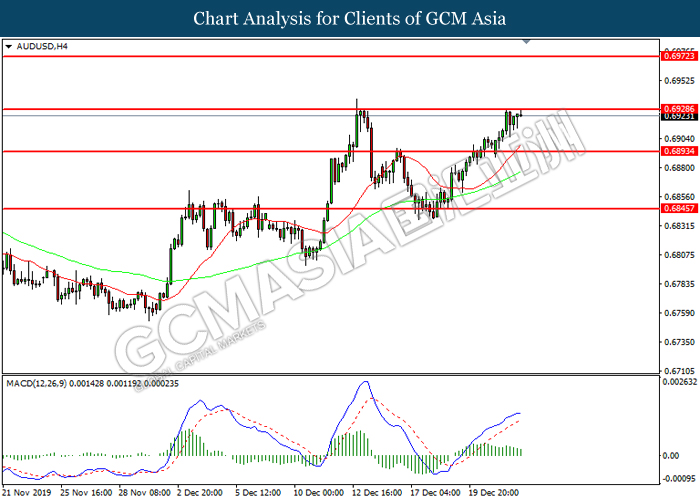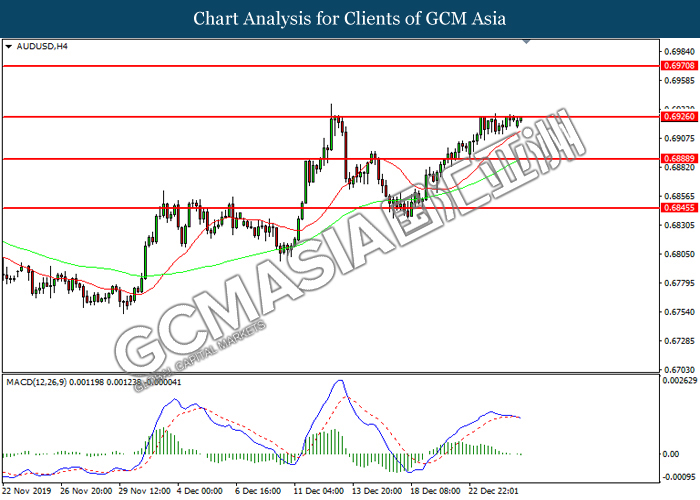 AUDUSD, H4: AUDUSD was traded higher while currently testing the resistance level at 0.6925. However, MACD which illustrated increasing bearish momentum suggest the pair to be traded lower in short-term as technical correction.
