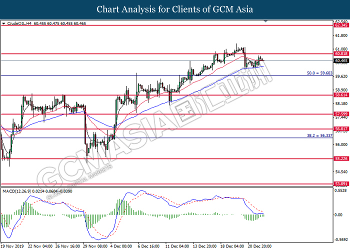 CrudeOIL, H4: Crude oil price was traded higher following prior rebound from the 50 moving average line (Blue). MACD which illustrate diminishing bearish momentum suggest the commodity to extend its gains toward the resistance level at 60.80.