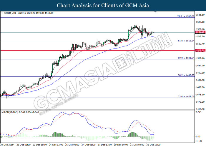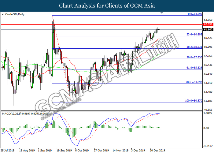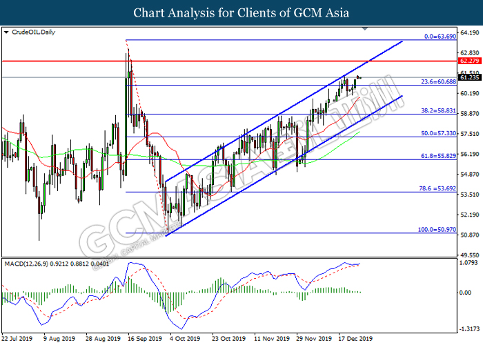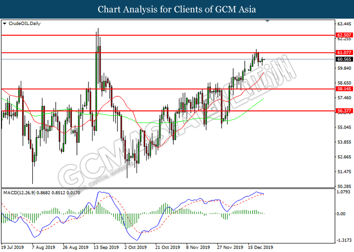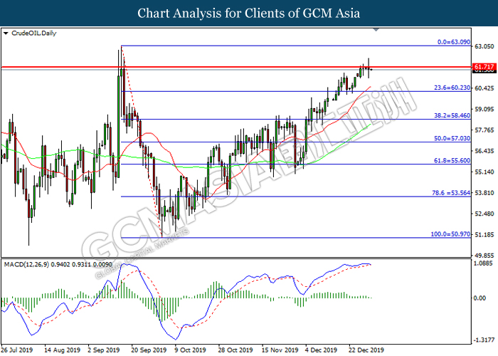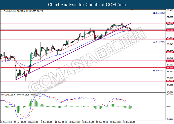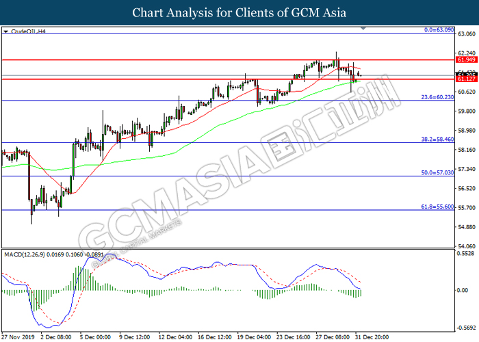 In the commodities market, crude oil price slumped on yesterday as investors start to worry about the future outlook for the demand for crude oil in the new year. On the other hand, the gold price surged on yesterday as the US-Middle East tension escalated, which weighed on the risk appetite in the FX market while insinuating the demand for the safe-haven metal. As of writing, crude oil price was traded flat at $61.12 per barrel while the gold price slumped 0.04% to $1527.95 per troy ounces.