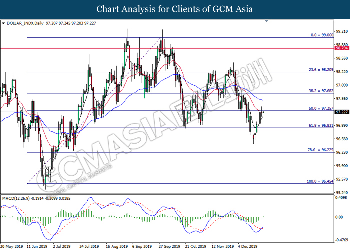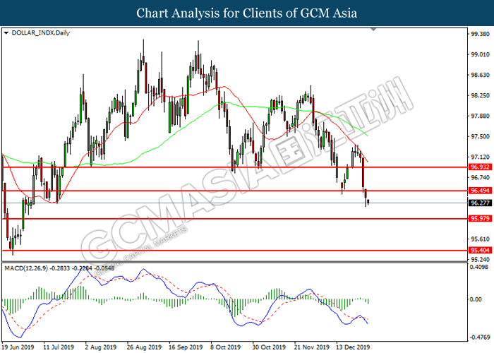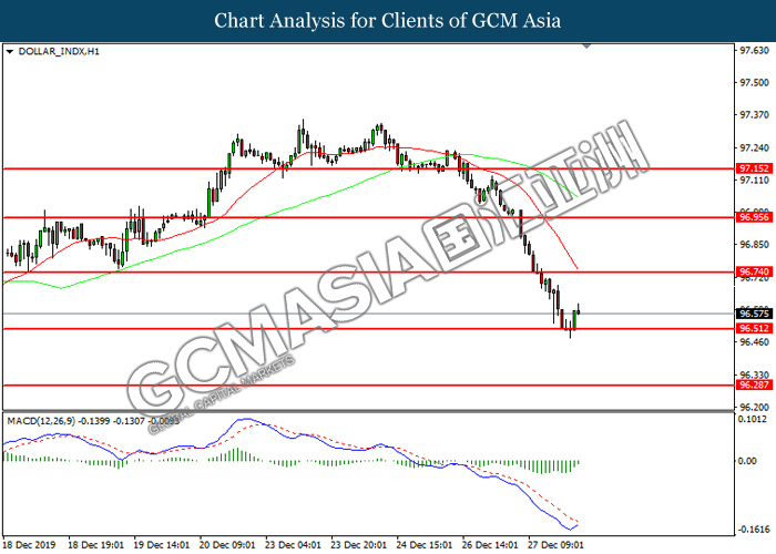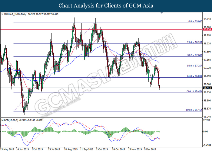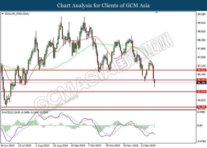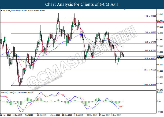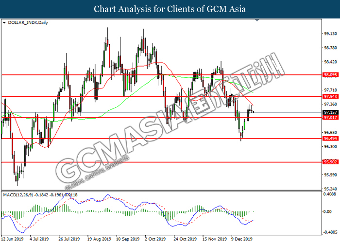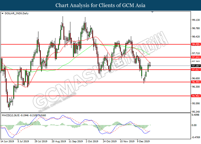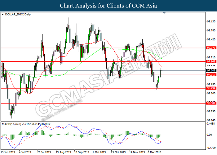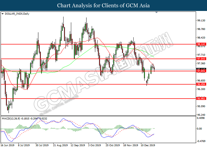 Dollar index which gauge its value against a basket of six major currencies plummeted after exacerbating of geopolitical risks between US and Iran. According to Iraqi state television, Iranian general Qassem Suleimani has been killed in an air strike at Baghdad International Airport early today. In this round of drone attack, there are total seven people were killed by the missile, blaming US was the country who fired the missile while no immediate comment from US as of now. The death of Iranian general instantly trigger huge demand for safe haven asset as Qassem is the second most powerful person in Iran, believingly that Iranian will protest and retaliate against US while a war seemingly is unavoidable. Back then, tensions between US and China has risen aggressively after US implemented sanctions against Iran crude oil exports due to violation of treaty. Afterward, the tensions between both countries does not seem to be faded over time while still remain tit-for-tat. However, US Defense Secretary Mark Esper said that ‘the game has changed’ after Iran attacked the U.S. Embassy in Baghdad, US President Donald Trump immediately assigned 750 soldiers to Middle East campsite as a rapid force available for use if war happened. During Asian trading session, dollar index inched down 0.09% to 96.75.
