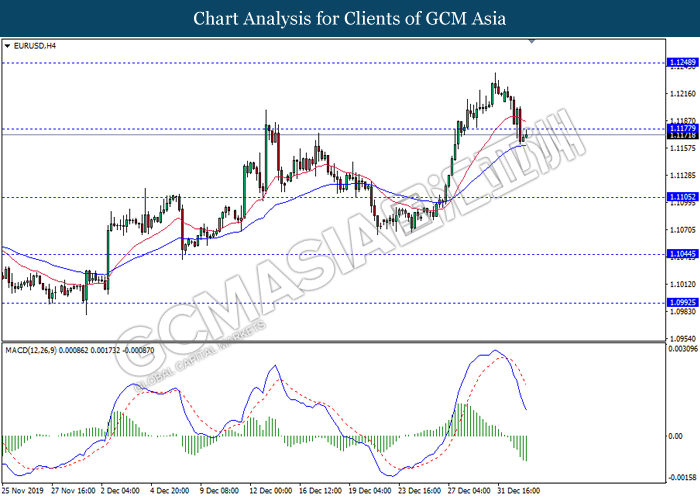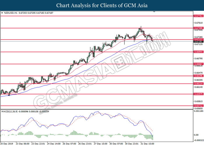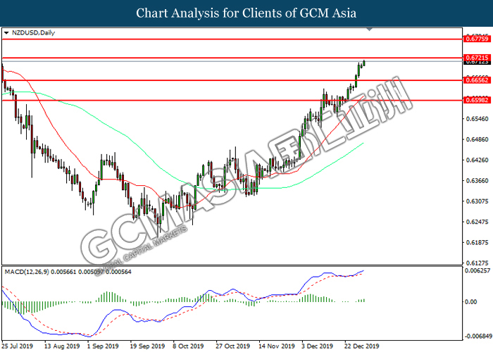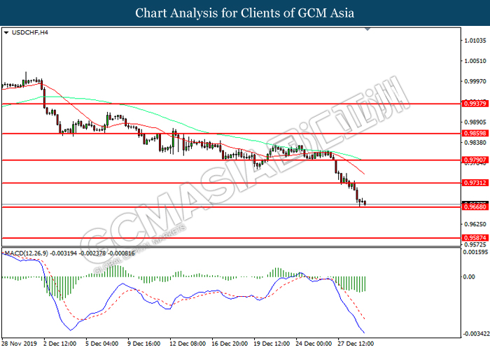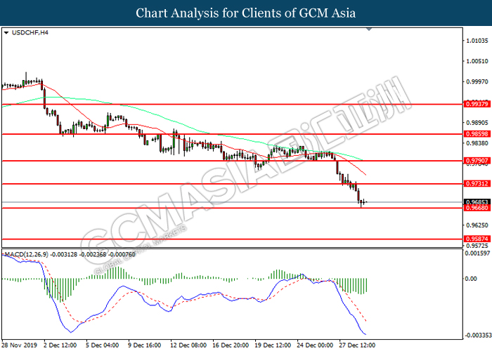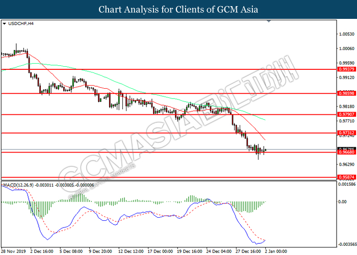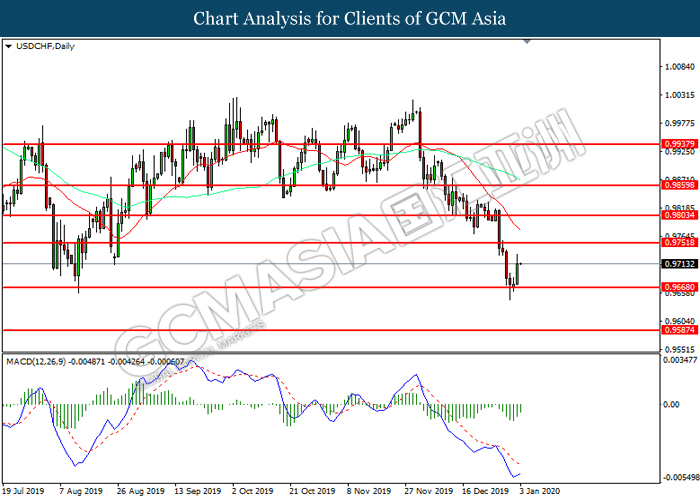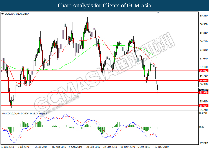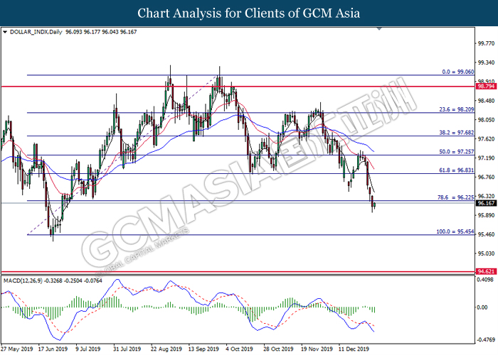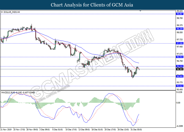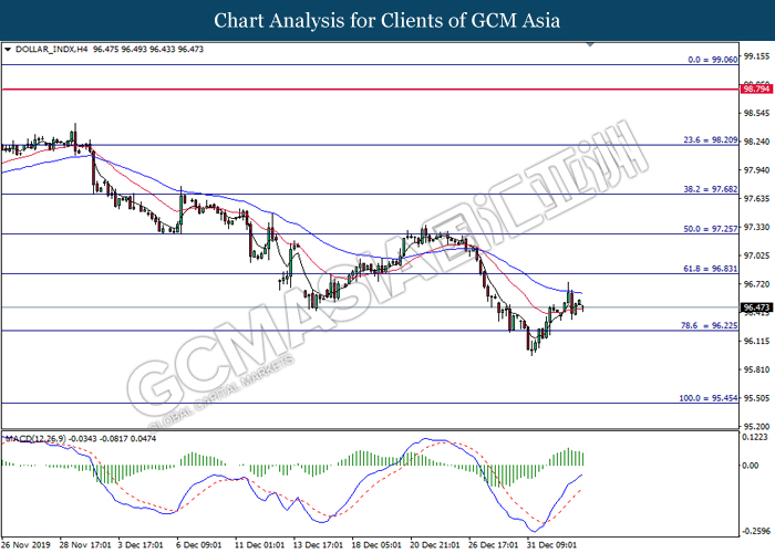 Dollar index which gauge its value against a basket of six major currencies plummeted after exacerbating of geopolitical risks between US and Iran. According to Iraqi state television, Iranian general Qassem Suleimani has been killed in an air strike at Baghdad International Airport early today. In this round of drone attack, there are total seven people were killed by the missile, blaming US was the country who fired the missile while no immediate comment from US as of now. The death of Iranian general instantly trigger huge demand for safe haven asset as Qassem is the second most powerful person in Iran, believingly that Iranian will protest and retaliate against US while a war seemingly is unavoidable. Back then, tensions between US and China has risen aggressively after US implemented sanctions against Iran crude oil exports due to violation of treaty. Afterward, the tensions between both countries does not seem to be faded over time while still remain tit-for-tat. However, US Defense Secretary Mark Esper said that ‘the game has changed’ after Iran attacked the U.S. Embassy in Baghdad, US President Donald Trump immediately assigned 750 soldiers to Middle East campsite as a rapid force available for use if war happened. During Asian trading session, dollar index inched down 0.09% to 96.75.