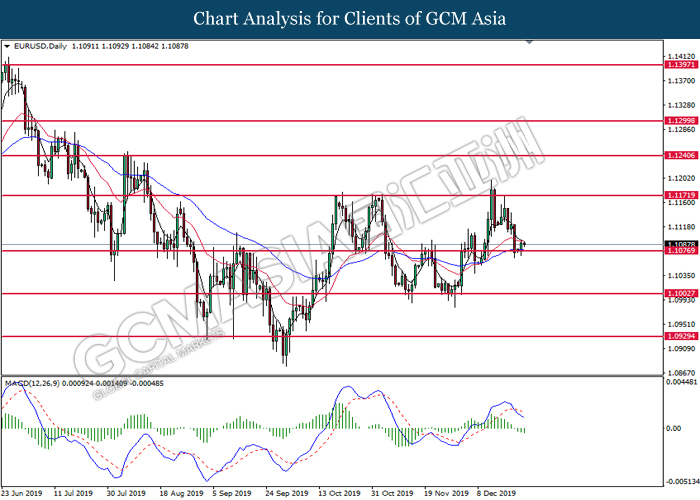 EURUSD, Daily: EURUSD was traded lower while currently testing the support level at 1.1075. MACD which illustrated bearish bias momentum suggest the pair to extend its losses after it successfully breakout below the support level at 1.1075.
