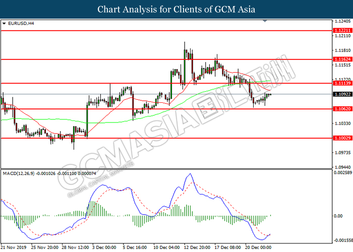 EURUSD, H4: EURUSD was traded higher following prior rebound from the support level at 1.1060. MACD which illustrated diminishing bearish momentum suggest the pair to extend its gains toward resistance level at 1.1115.