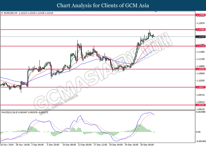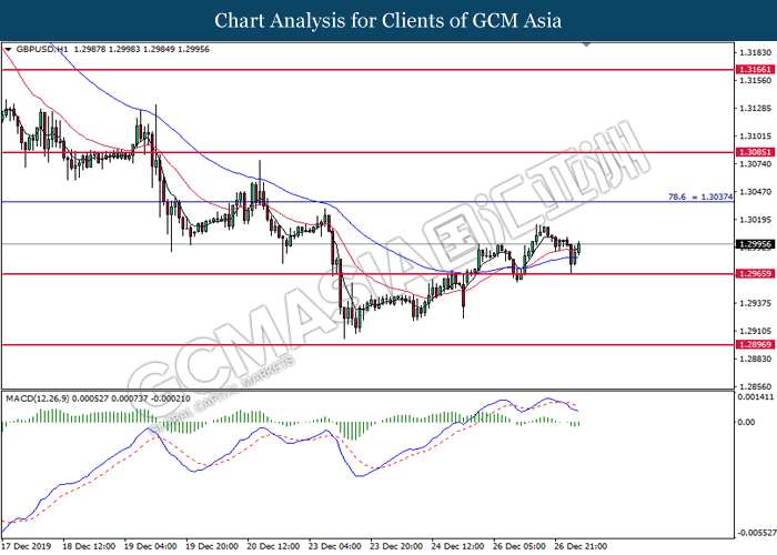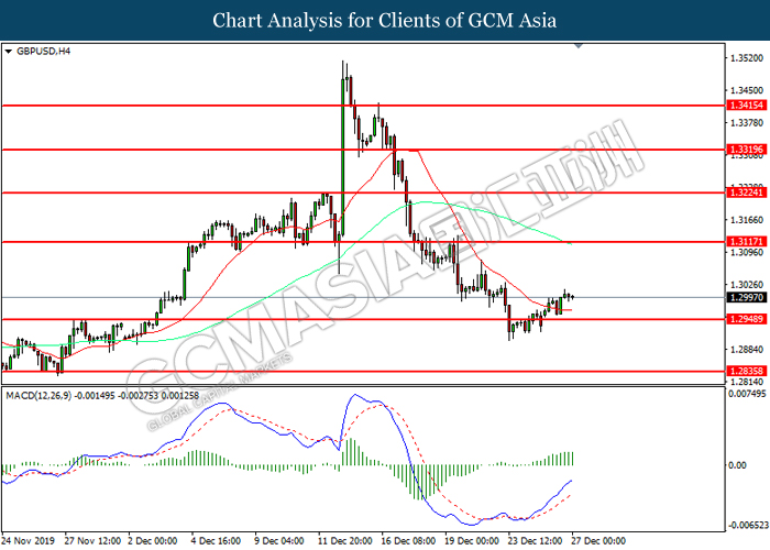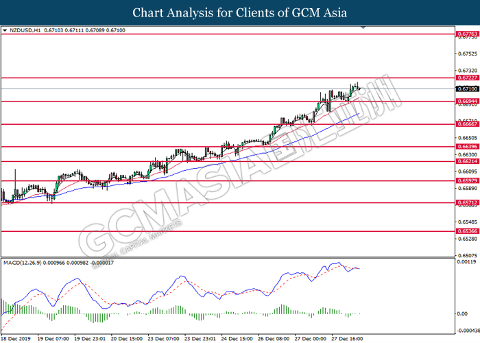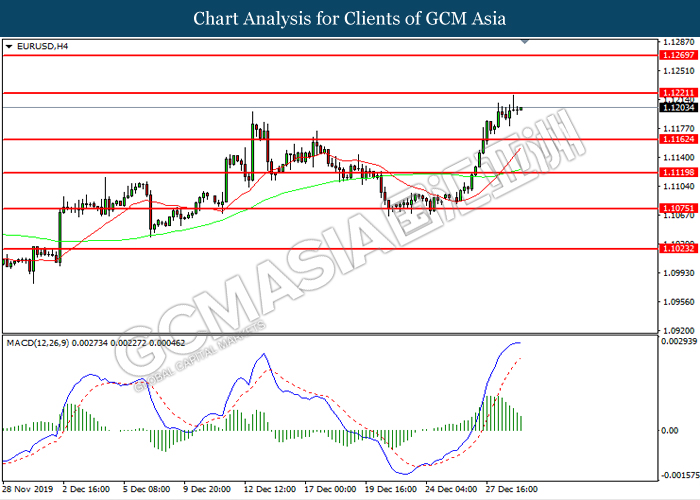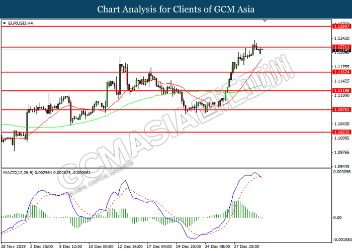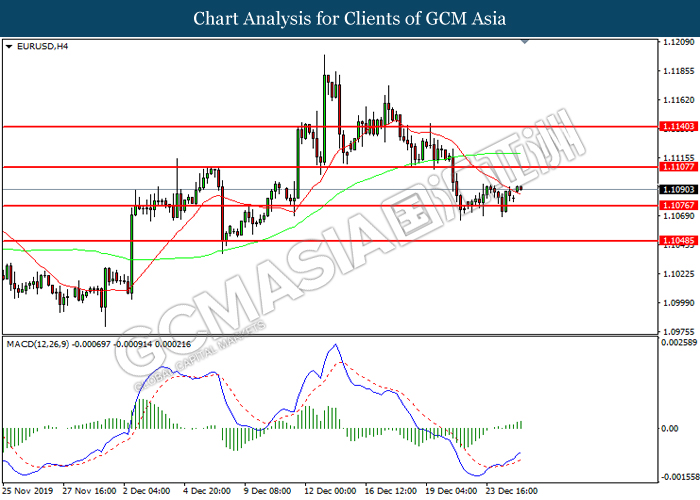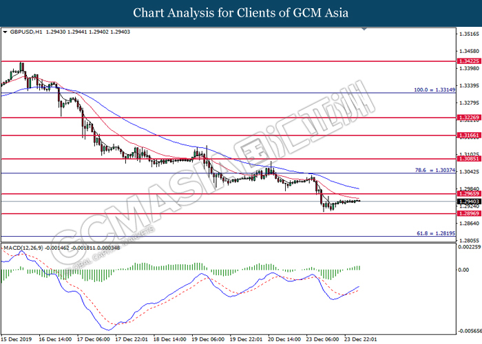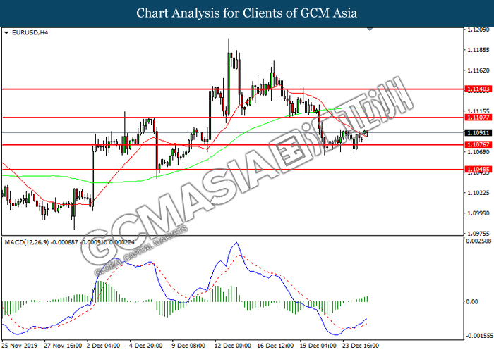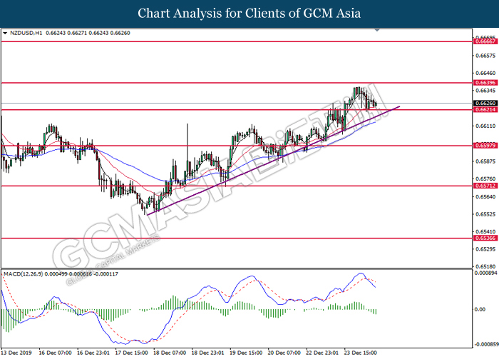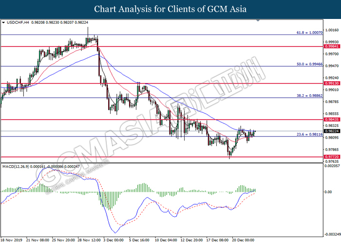 Dollar index which measured against a basket of six major currency pairs have held steady during late Asian session ahead of Christmas. As the market celebrating the Christmas, trading volume have been subdued by the holiday break. However, the greenback remain buoyed as market continue to positively react towards the trade development and signs of solid U.S economy despite thin market. In regards of relationship between U.S and China, the sentiment was mixed as U.S President Donald Trump stated that he have a very “nice talk” with the China and also hinted the possibility of signing trade deal in January. However, on the other hand China criticized U.S. on interfering in its internal affairs on Hong Kong, Taiwan and other matters. The news could regain the tension between the both powerhouses and could reduce the possibility of signing the phase one trade deal. Still, recent economy data that published on Friday showed the U.S. economy, already in its longest expansion in history which continue to supporting the demand for the greenback while market awaits further progress on trade talk next month. At the time of writing, dollar index ticked higher 0.03% to 97.23.