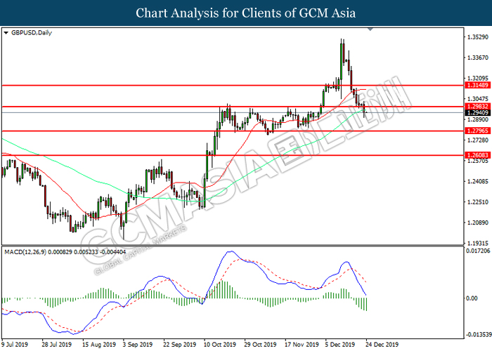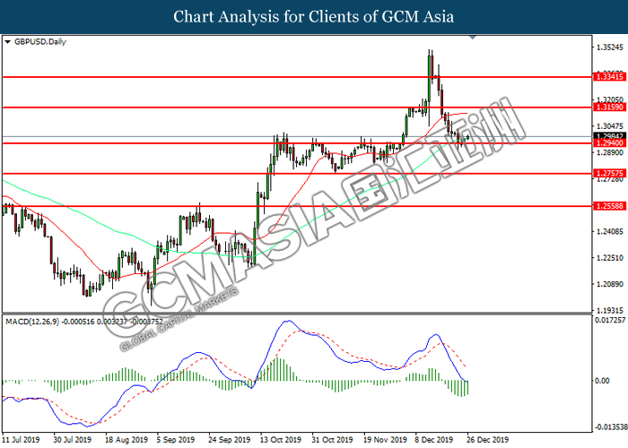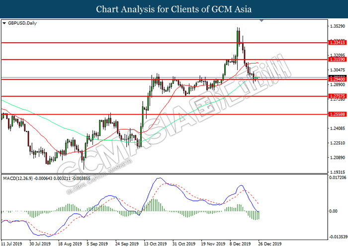 GBPUSD, Daily: GBPUSD was traded lower while currently testing the support level at 1.2940. However, MACD which illustrated diminishing bearish momentum suggest the pair to be traded higher in short-term as technical correction.