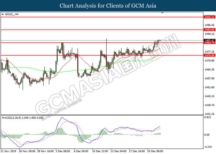 GOLD_, H4: Gold price was traded higher following prior breakout above the previous resistance level at 1483.80. However, MACD which illustrated diminishing bullish momentum suggest the commodity to be traded lower in short-term as technical correction.