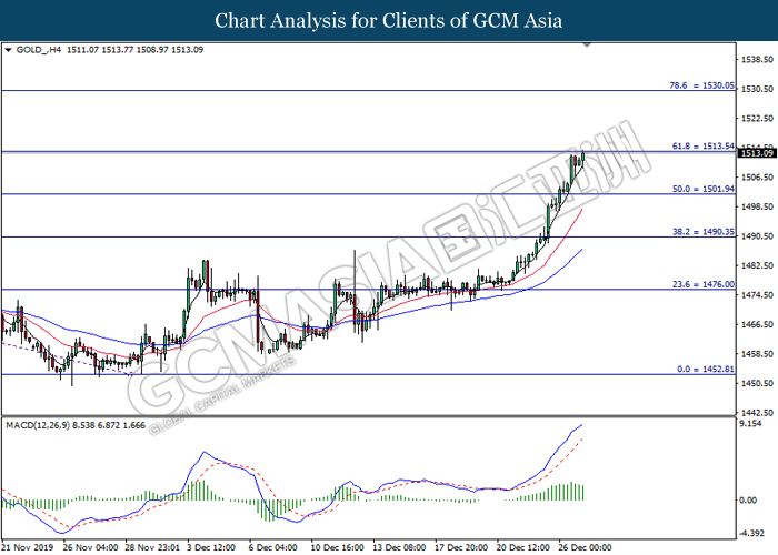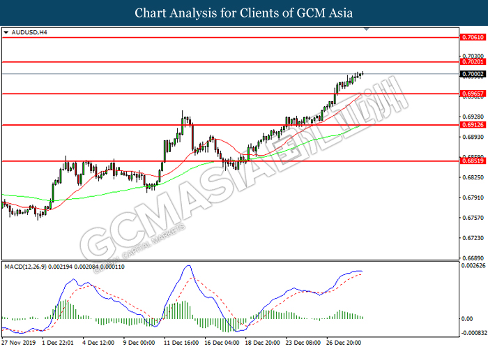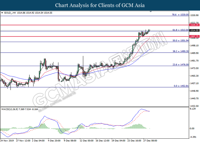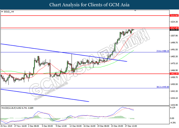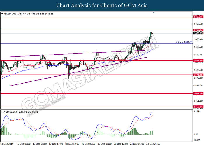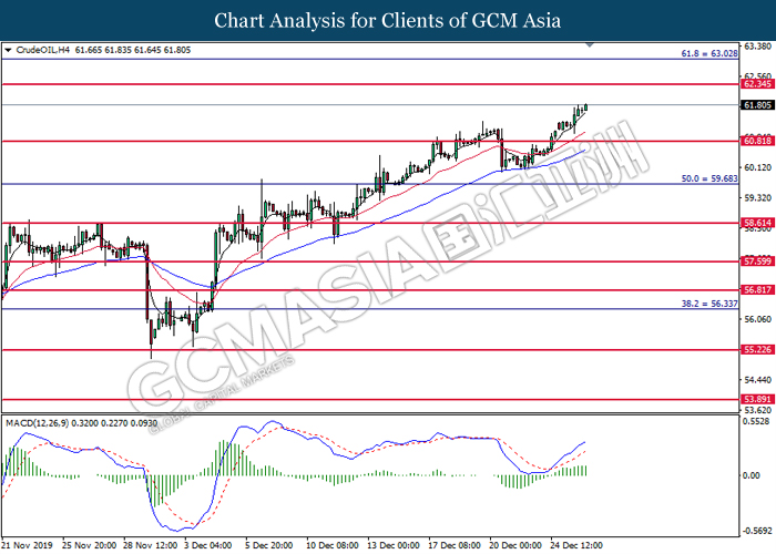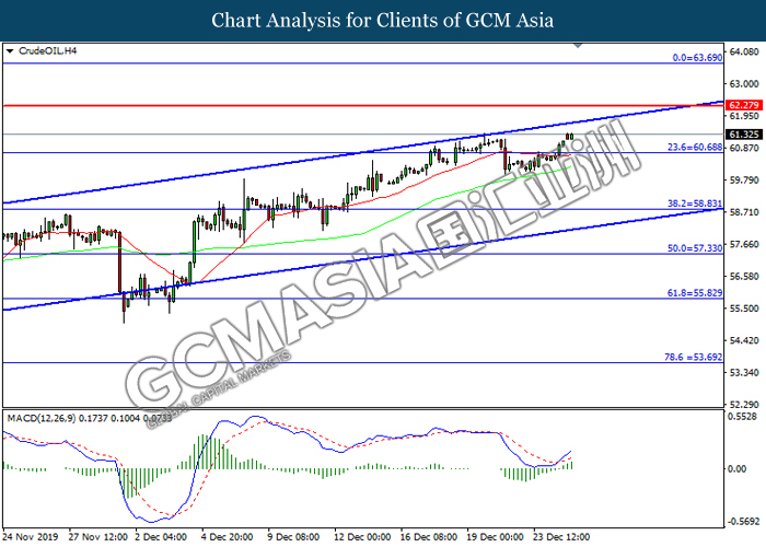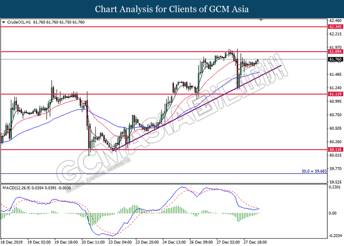 In the commodities market, the crude oil price was traded flat at $61.20 per barrel. The oil market edged higher on Tuesday following Russia claimed that they would continue to cooperation with OPEC on supply cuts and amid optimism that the United States and China could finalize a trade agreement soon. On the other hand, gold price skyrocketed on Christmas Eve as investors continued to seek out the yellow metal as an insurance to a potential slide in equity market during the early 2020. As of writing, gold price appreciated by 0.08% to $1499.40 per troy ounces.