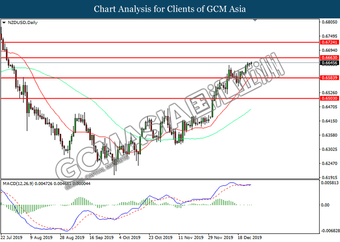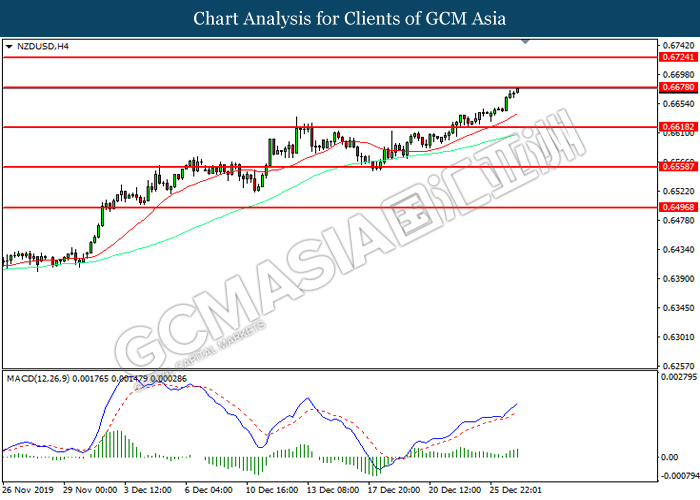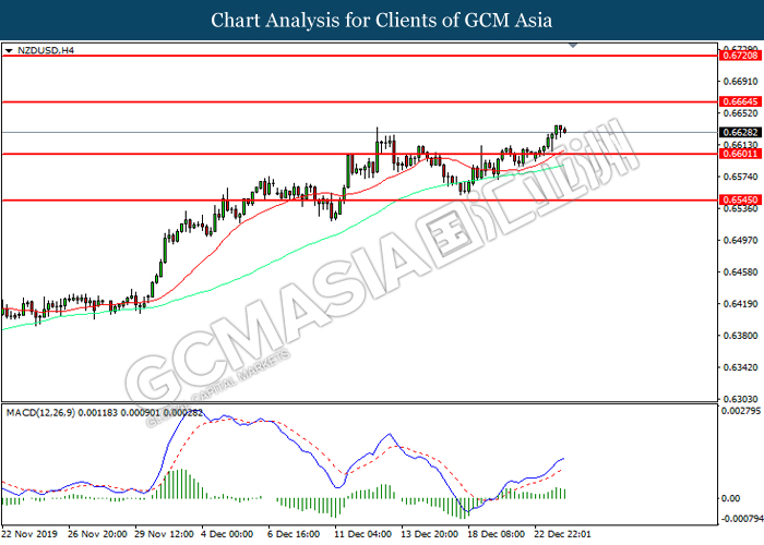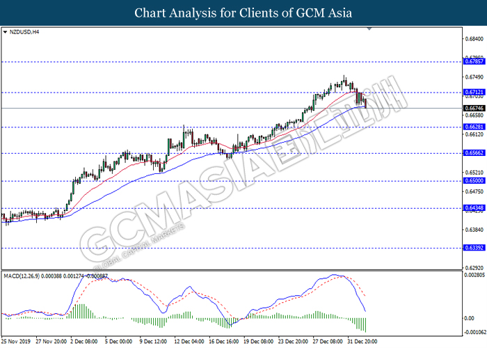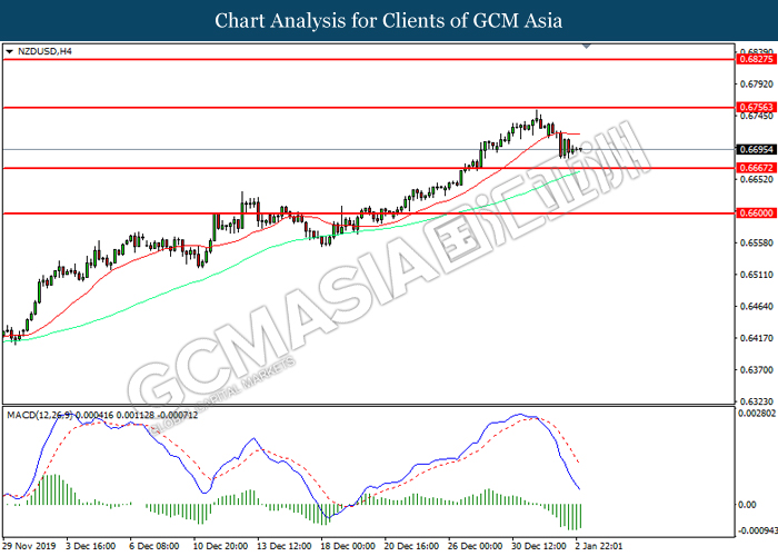 NZDUSD, H4: NZDUSD was traded higher following prior breakout above the previous resistance level at 0.6600. However, MACD which illustrated diminishing bullish momentum suggest the pair to be traded lower in short-term as technical correction.
