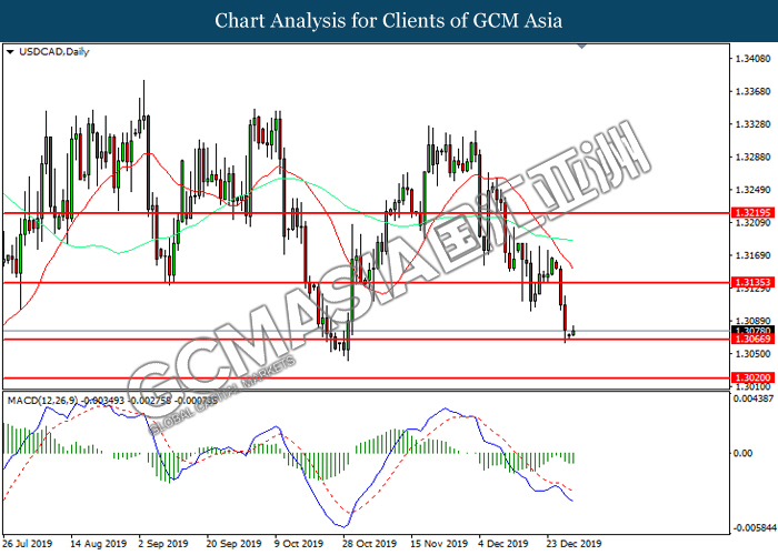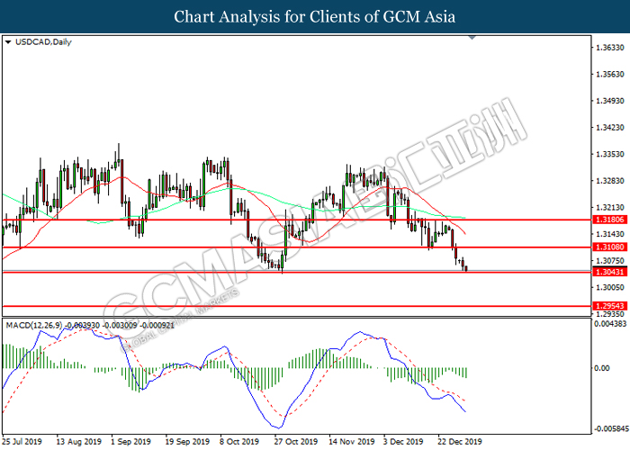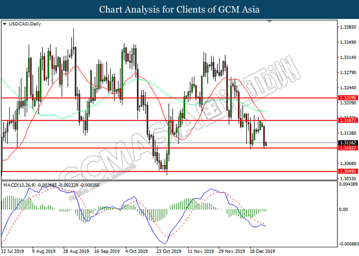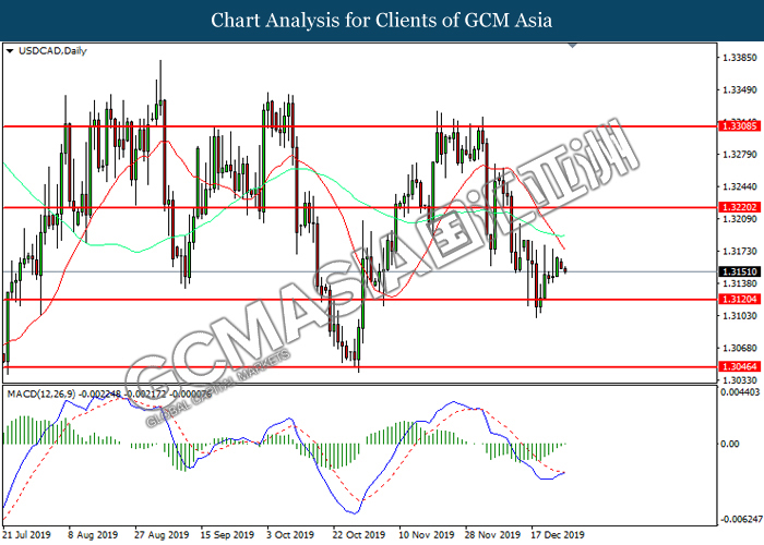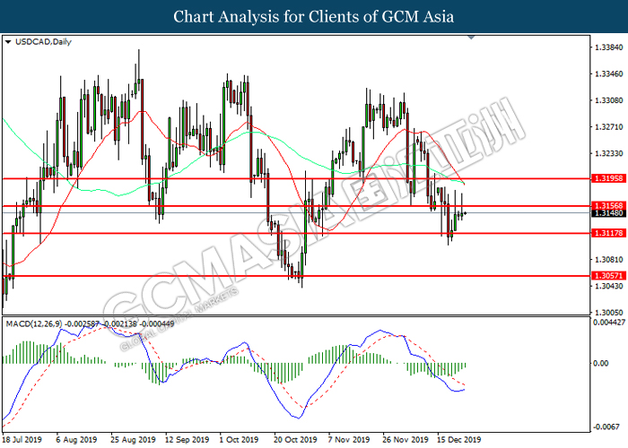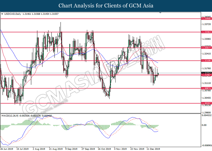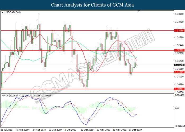 USDCAD, Daily: USDCAD was traded higher following prior rebound from the support level at 1.3120. MACD which illustrated diminishing bearish momentum suggest the pair to extend its gains toward resistance level at 1.3220.