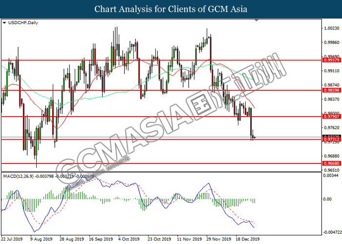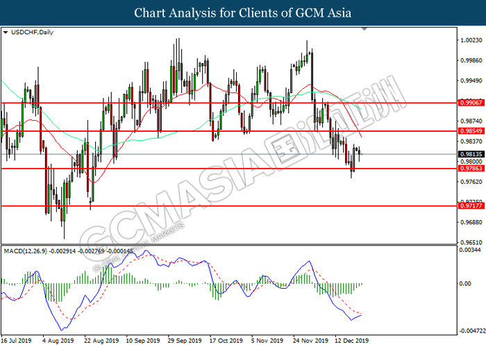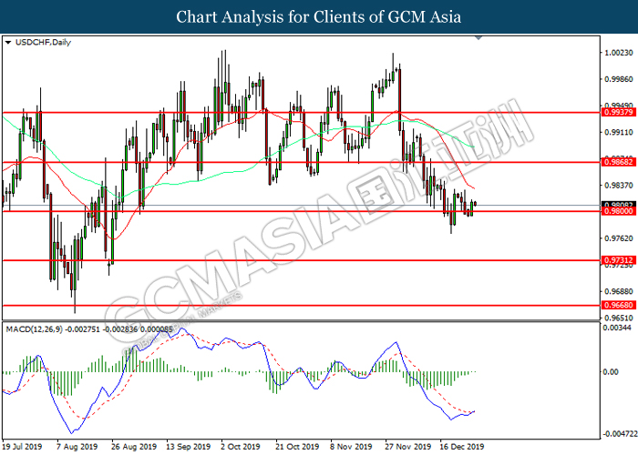 USDCHF, Daily: USDCHF was traded higher following prior rebound from the support level at 0.9785. MACD which illustrated diminishing bearish momentum suggest the pair to extend its gains toward resistance level at 0.9855.