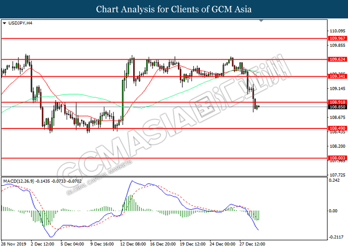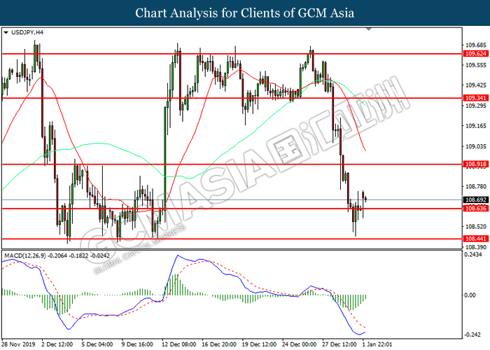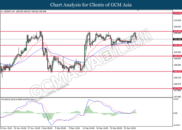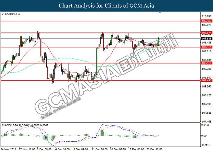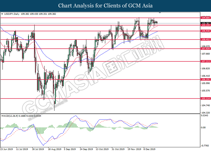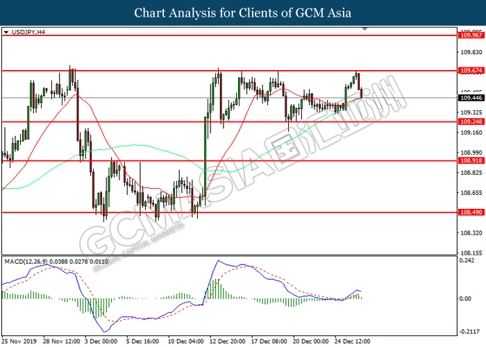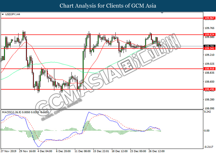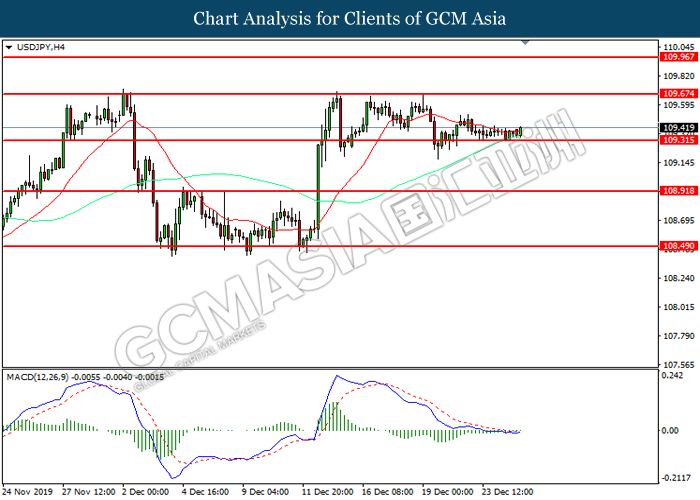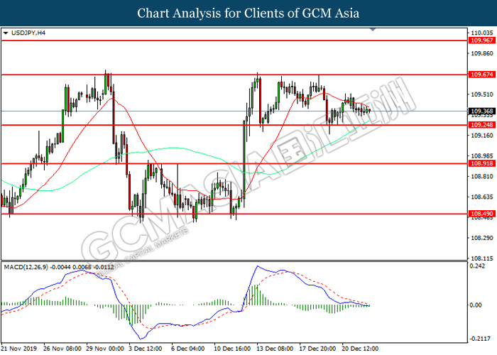 USDJPY, H4: USDJPY was traded within a range while currently testing the support level at 109.30. MACD which illustrated diminishing bearish momentum suggest the pair to be traded higher in short-term as technical correction.
