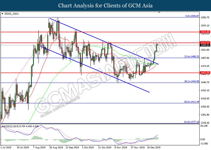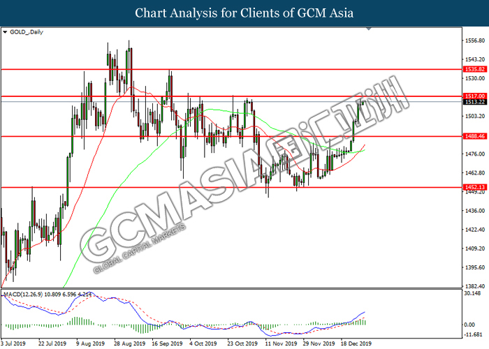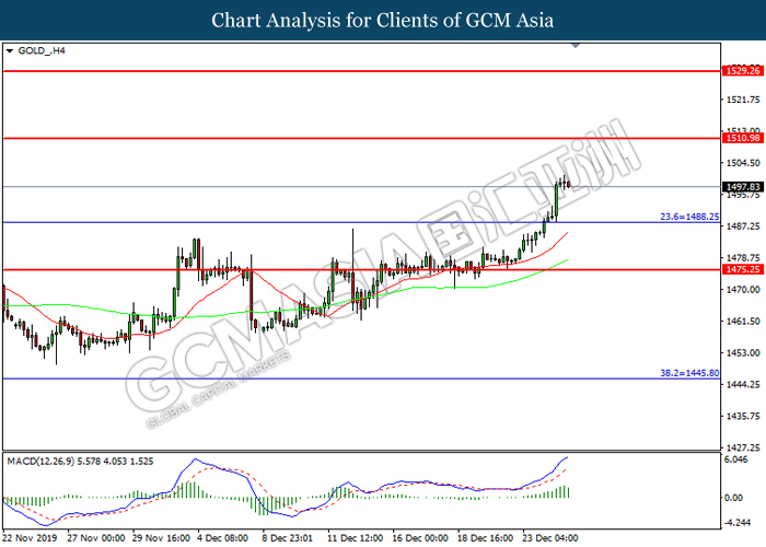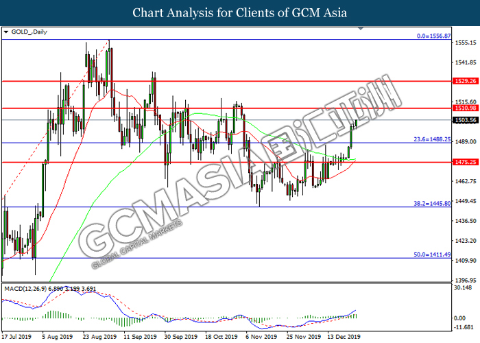 GOLD_, Daily: Gold price was traded higher following prior breakout above the previous resistance level at 1488.25. However, MACD which illustrated diminishing bullish momentum suggest the commodity to be traded lower in short-term as technical correction