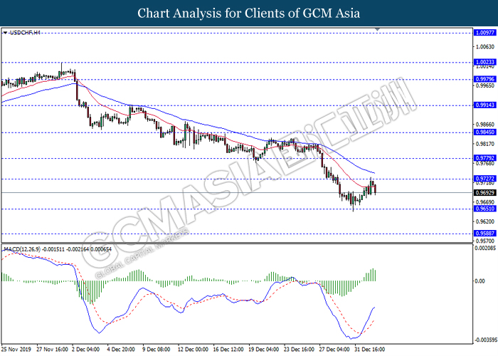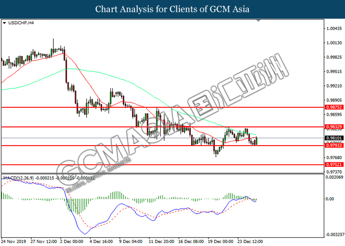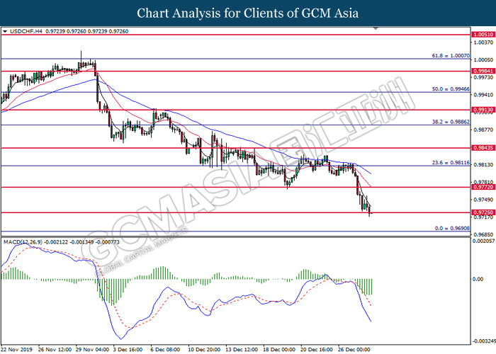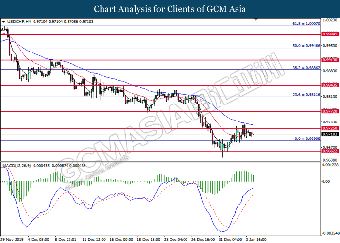 USDCHF, H4: USDCHF was traded flat near the 20 moving average line (Red). MACD which illustrated diminishing bullish momentum suggest the pair to be traded lower in short term toward the support level at 0.9690.