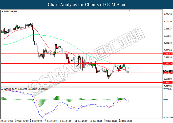 USDCHF, H4: USDCHF was traded lower while currently testing the support level at 0.9795. MACD which illustrated increasing bearish momentum suggest the pair to extend its losses after it successfully breakout below the support level.