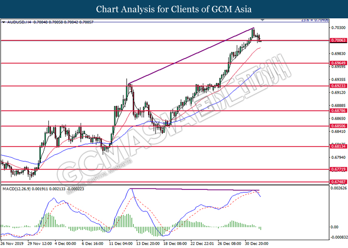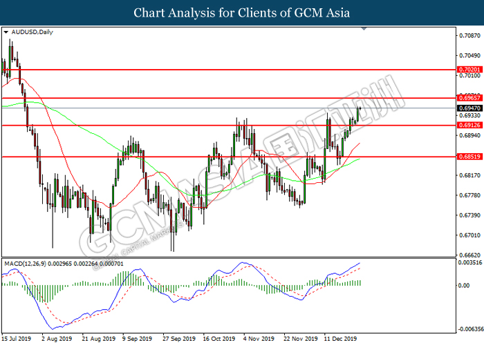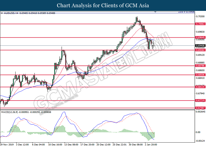 AUDUSD, H4: AUDUSD was traded higher following prior rebound from the support level at 0.6925. MACD which illustrated diminishing bearish momentum suggest the pair to extend its gains toward the resistance level at 0.6965.
