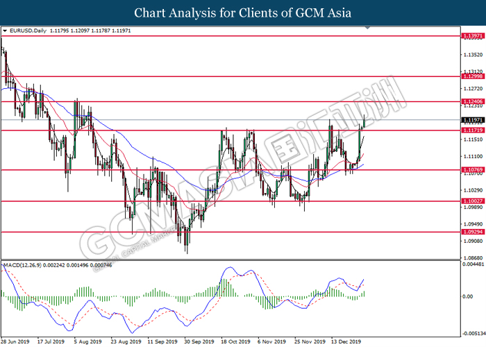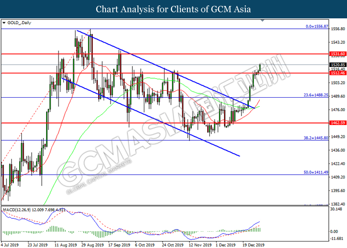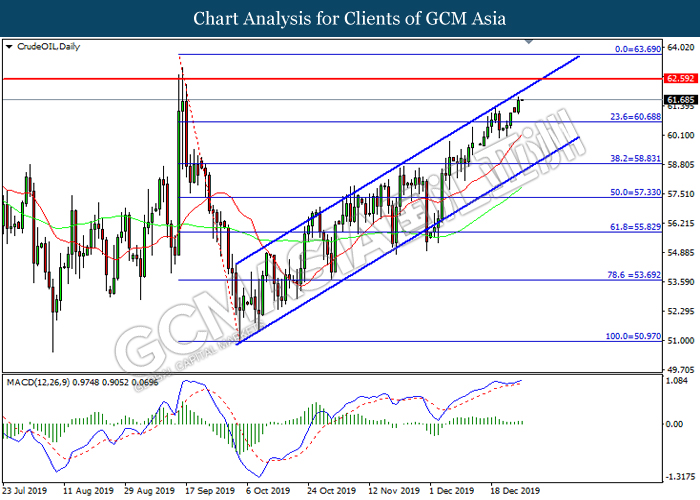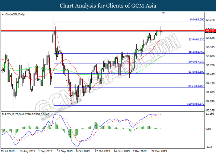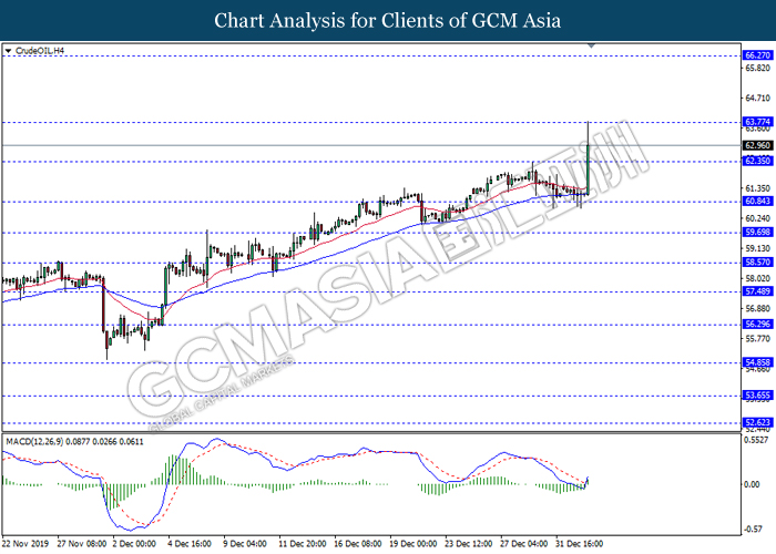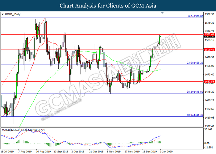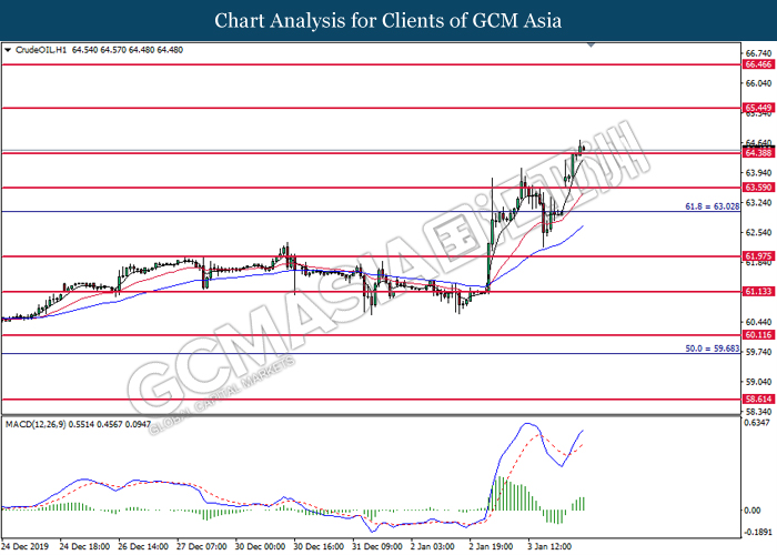 In the commodities market, crude oil price skyrocketed 2.46% to $64.60 per barrel amid heightening of geopolitical tensions in Middle East region expected will significantly disrupt the crude oil supplies. As of now, market are still awaiting for further news regarding to US-Iran’s tensions to determine the direction of crude oil. Besides, gold prices rose 1.72% to $1578.10 a troy ounce as market risk-off sentiment lifted up this yellow metal’s demand.