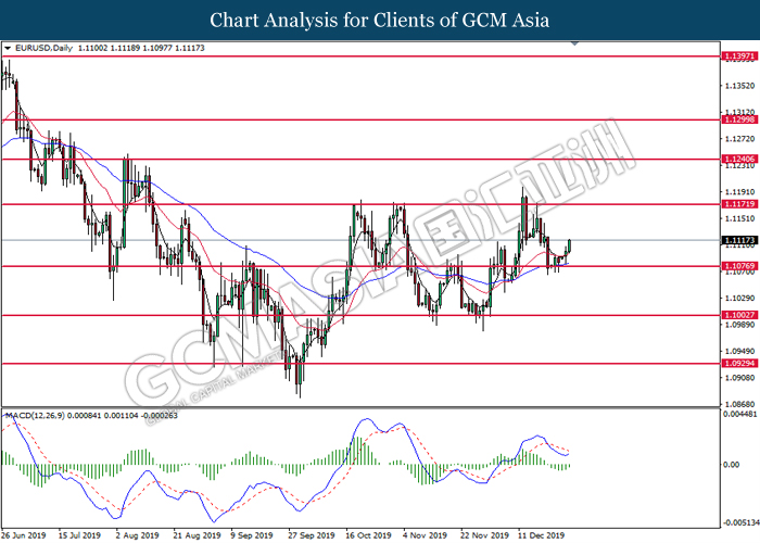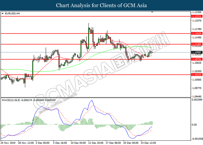 EURUSD, H4: EURUSD was traded higher following prior rebound from the support level at 1.1075. MACD which illustrated increasing bullish momentum suggest the pair to extend its gains toward resistance level at 1.1105.