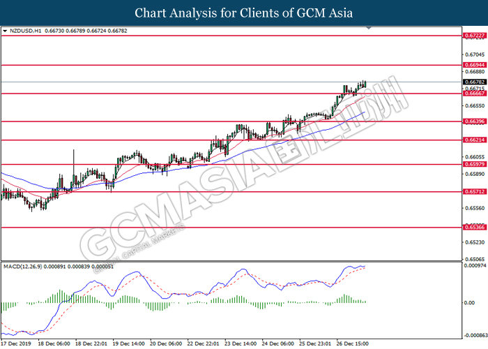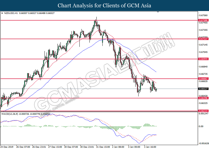 NZDUSD, H1: NZDUSD was traded lower following prior retracement from the resistance level at 0.6665. MACD which illustrated diminishing bullish momentum suggest the pair to extend its losses toward the support level at 0.6640.